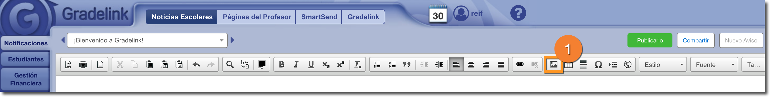 Puede cargar imágenes para mejorar la calidad de las Noticias Escolares o en las páginas de los docentes cargando el archivo en Gradelink directamente desde su computadora.