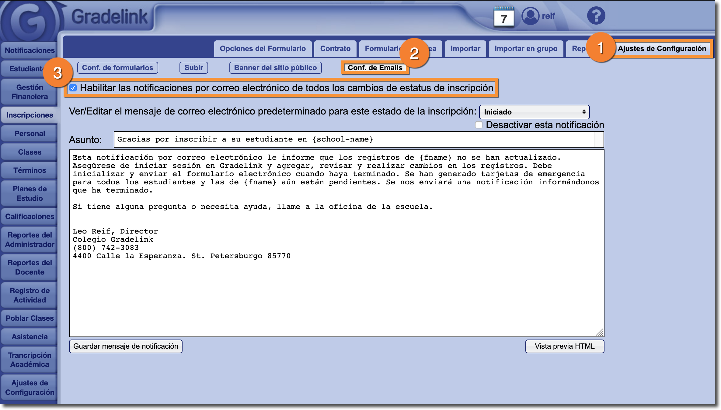 Un administrador puede habilitar o deshabilitar todas las alertas de EnrollMe principales activando la casilla "Habilitar las notificaciones por correo electrónico de todos los cambios de estadus de inscripción".
