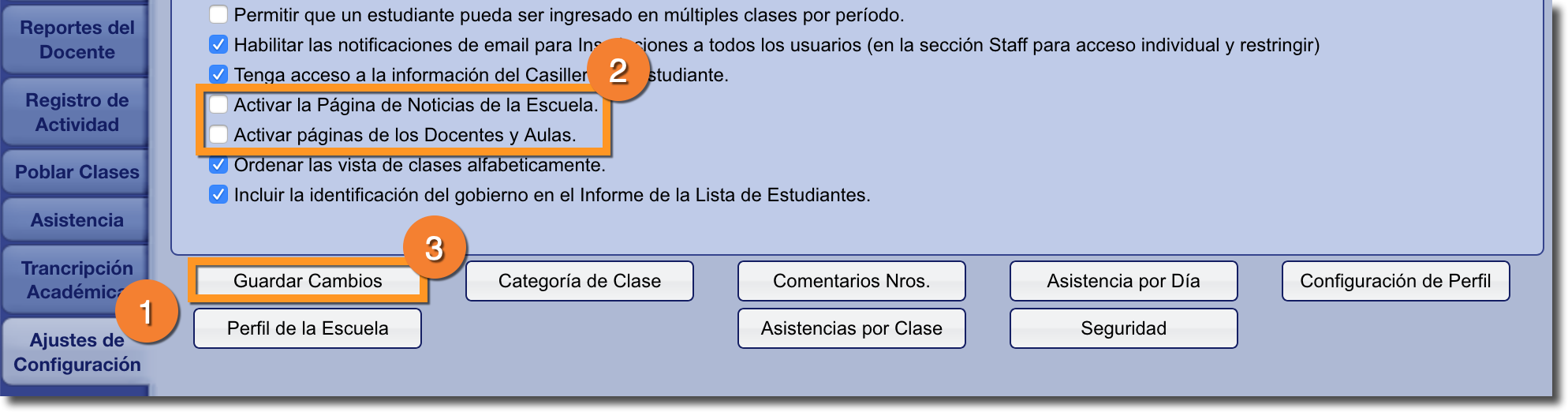 Si las páginas de los profesores y / o los botones de Noticias escolares no están visibles en la sección 'Notificaciones', es posible que un Administrador deba activar estas funciones:
