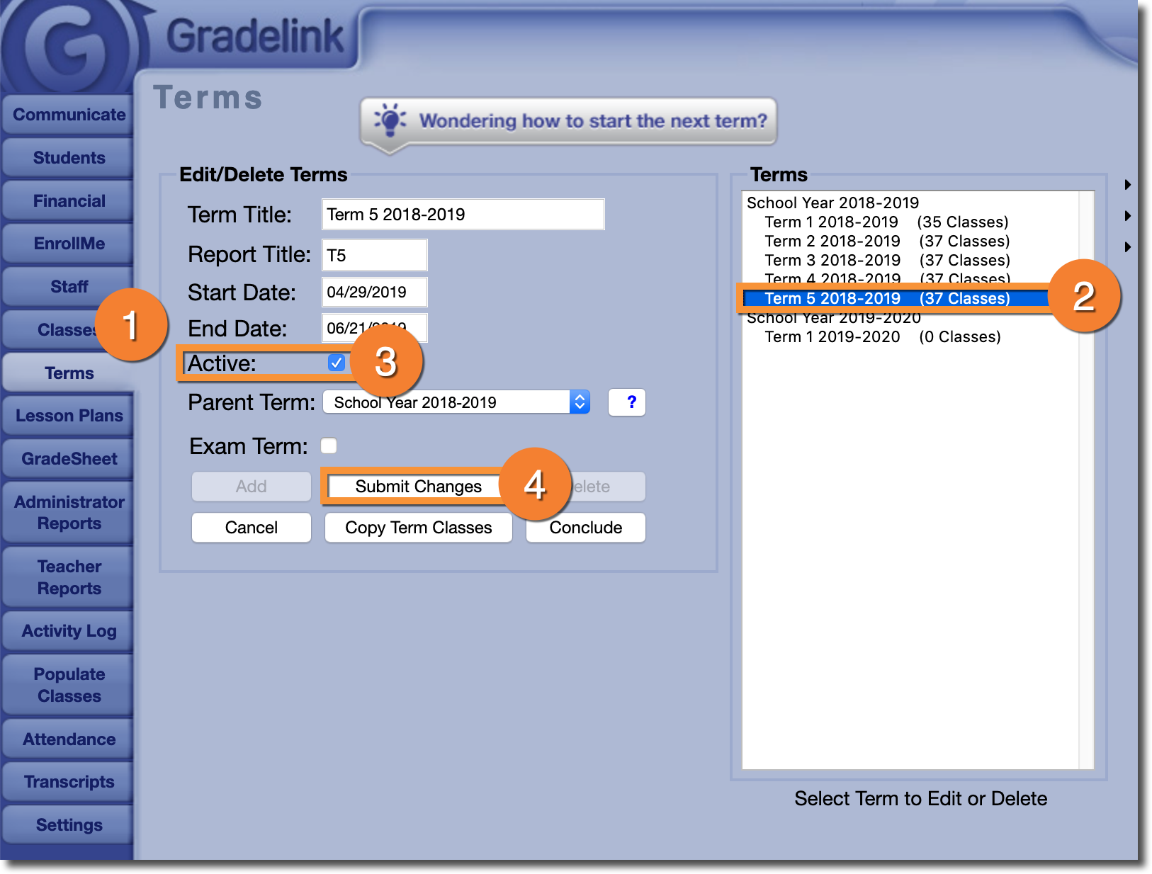 By default, Teachers will only have access to classes associated with the active term. That is why it is important to activate and deactivate the appropriate terms as you progress through the school year. While it is possible to have multiple terms active at the same time, depending on the number of classes assigned to each teacher, the interface could become cluttered very quickly so Gradelink doesn't typically recommend having more than one active term.
