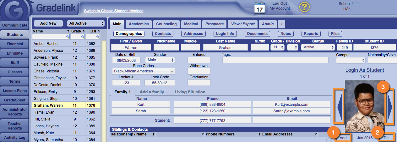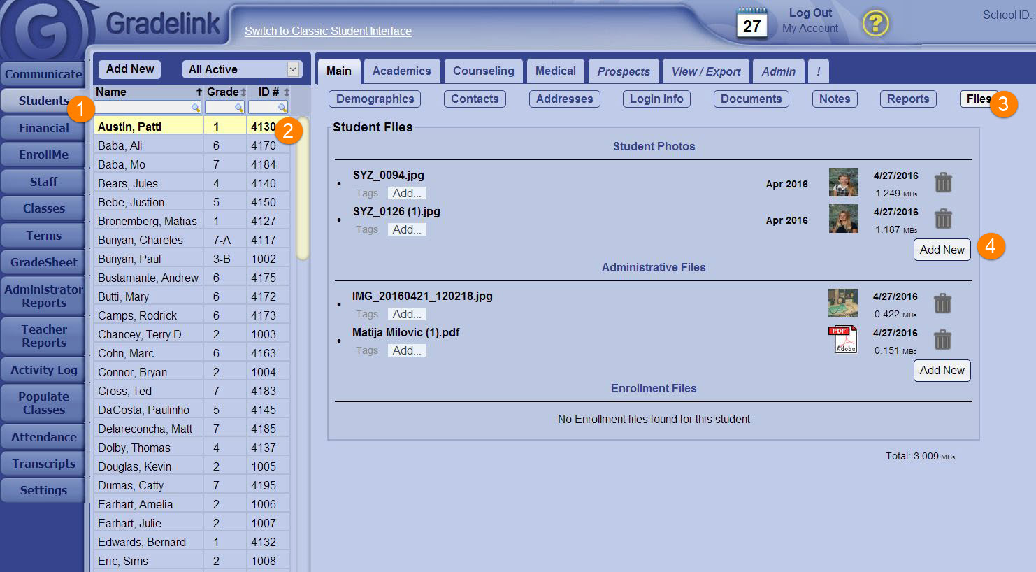 There are two ways to add student photos in Gradelink: through the Demographics page or through the Files page.