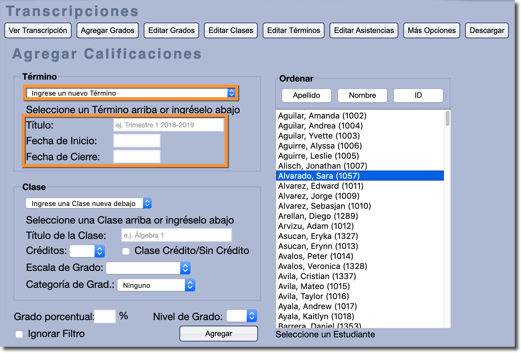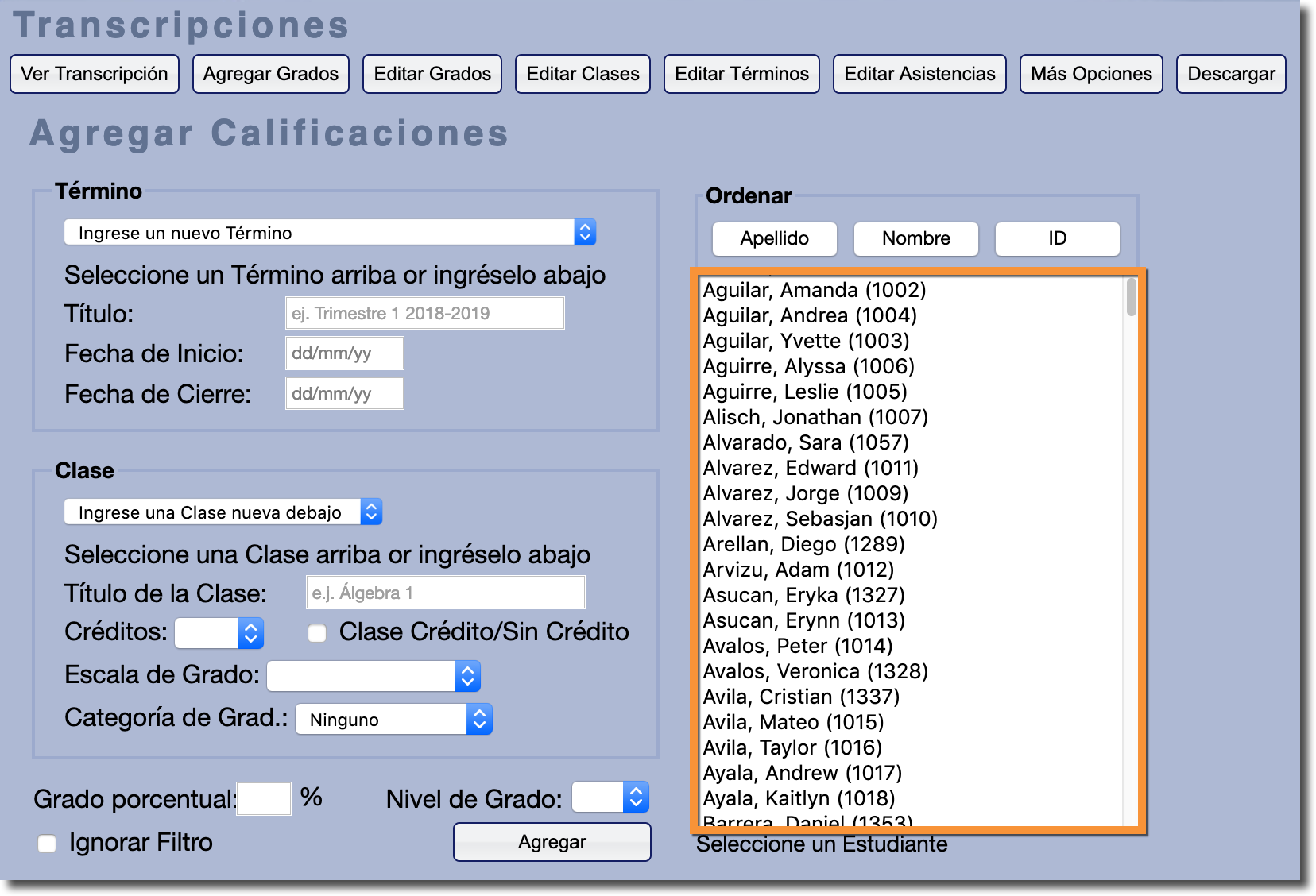 Para agregar manualmente una calificación a la transcripción, primero deberá seleccionar el Estudiante al que le gustaría agregar una calificación para utilizar la lista de estudiantes de la derecha.