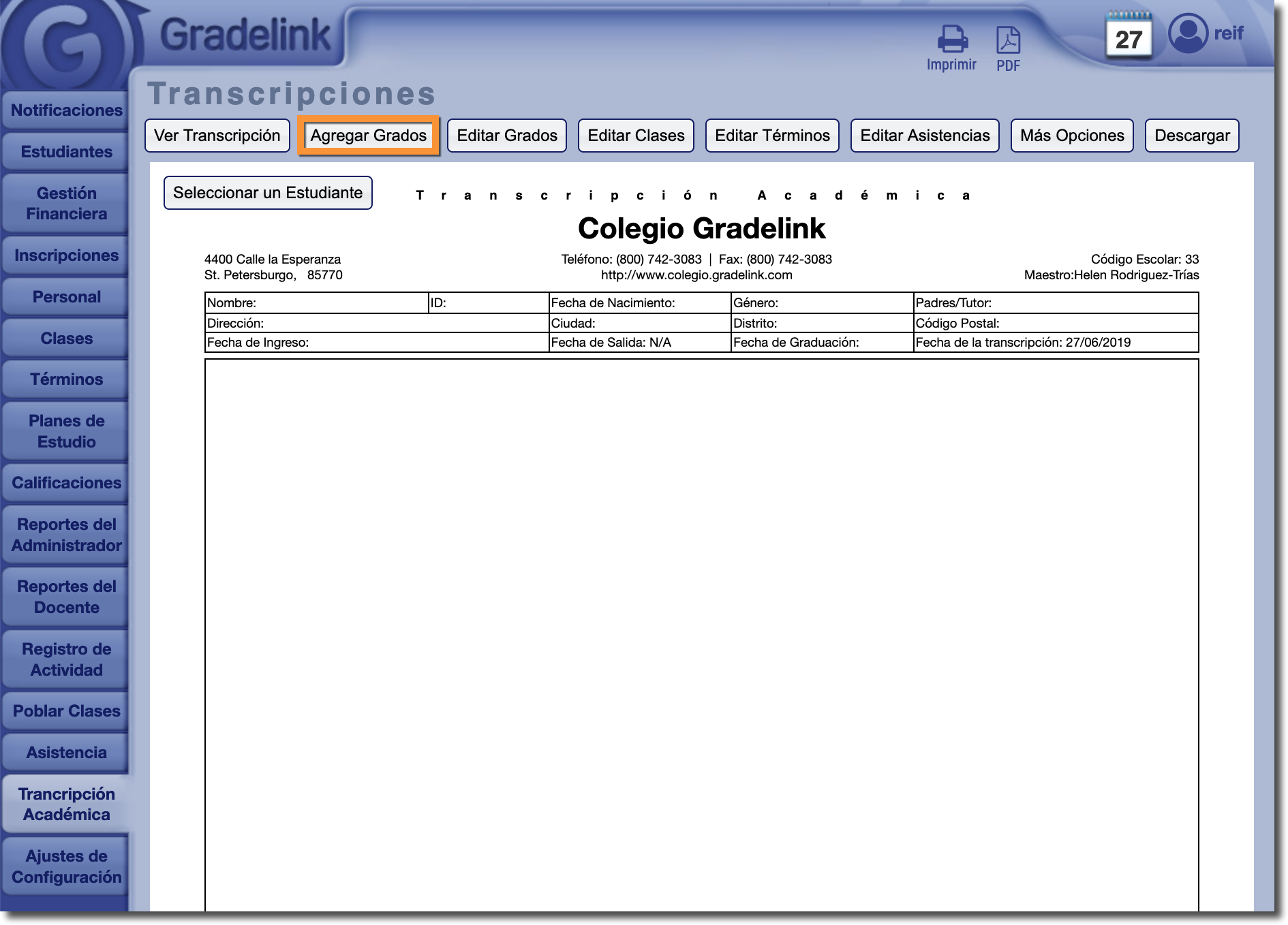 Al igual que en el boletín de calificaciones, las calificaciones se agregan a la transcripción académica automáticamente cada vez que se concluye una clase. Sin embargo, Gradelink permite a los administradores agregar manualmente nuevas calificaciones a la transcripción también. Esto es útil cuando un estudiante se transfiere de otra escuela y sus datos de calificaciones existentes deben importarse a Gradelink.