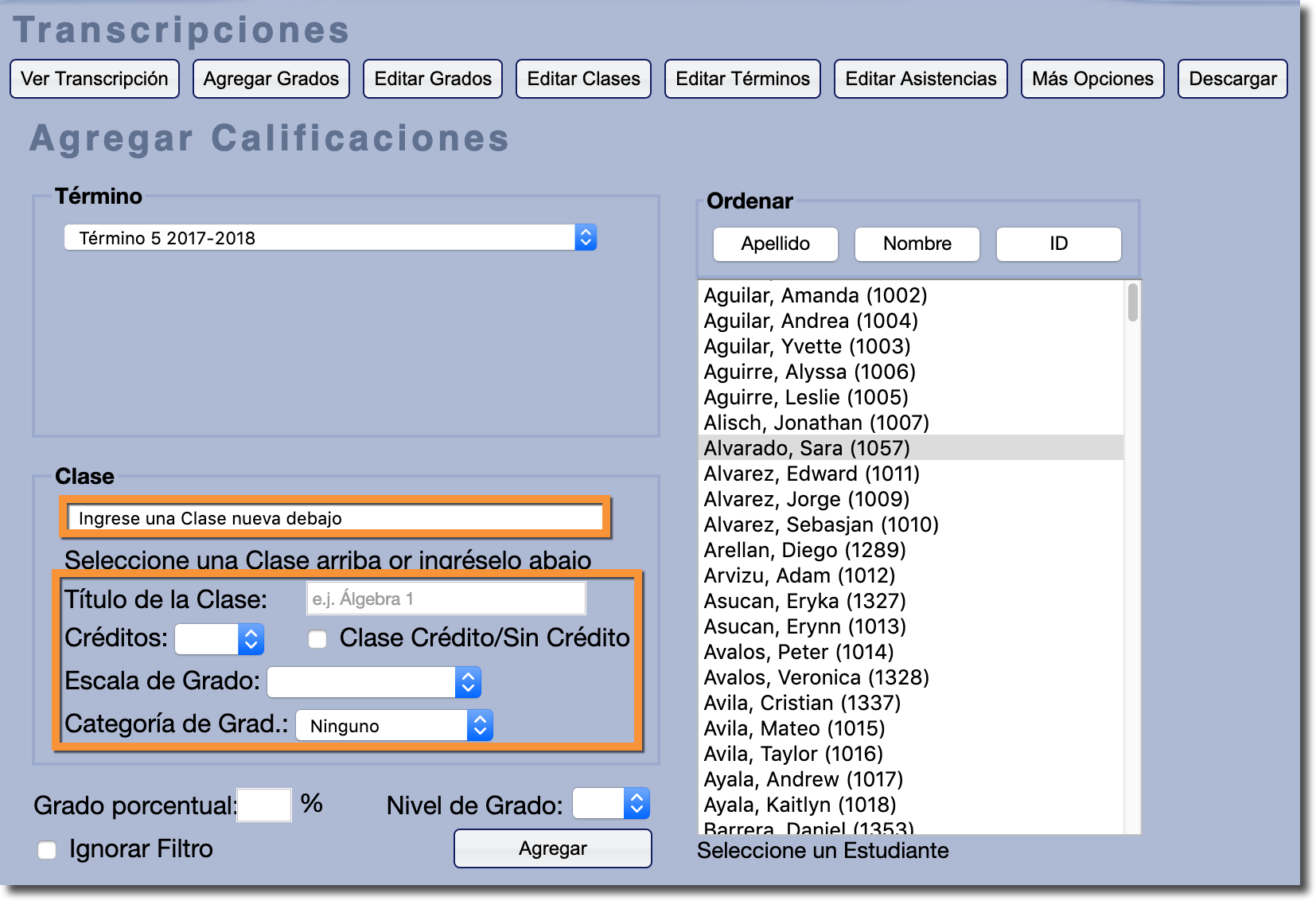Agregar manualmente nuevas calificaciones a la transcripción