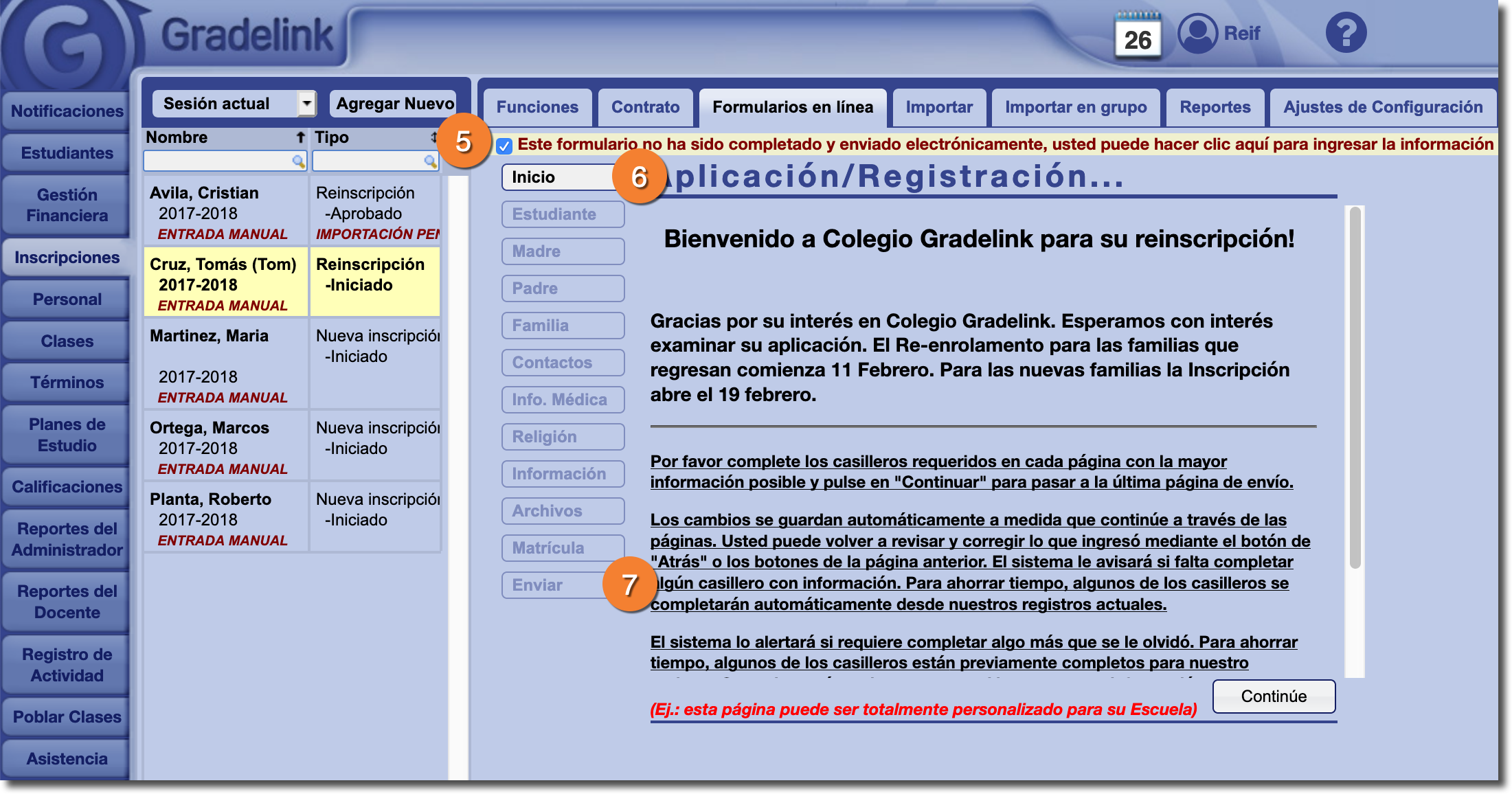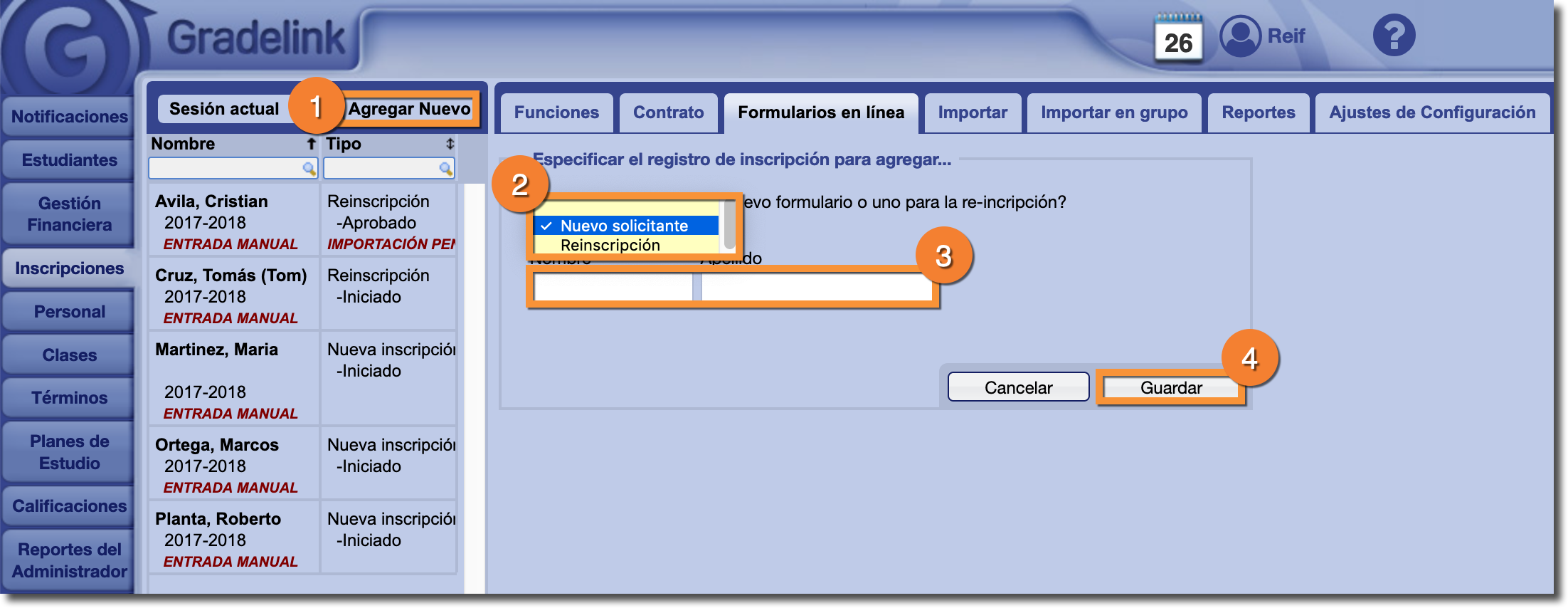 - Aquí especifique el registro de inscripción a agregar, y elija entre "Nuevo solicitante" o "Reinscripción".
