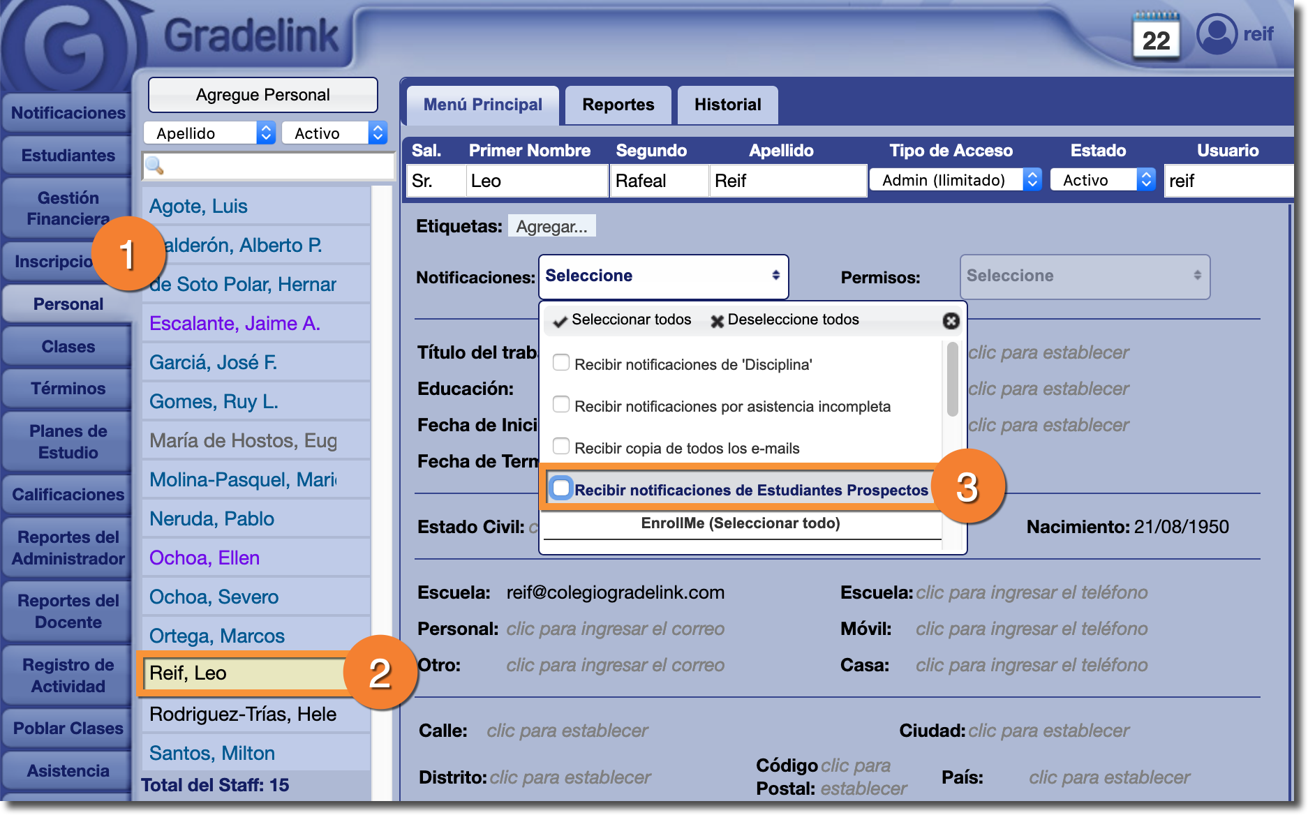 - Abra el menú de Notificaciones y marque las casilla "Recibir notificaciones de Estudiantes Prospectos"