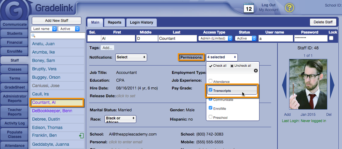 - Select the limited administrator who you would like to grant access to transcripts