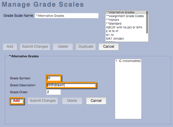 - Click Add after every newly entered Alternative Grade, or click on Submit Changes if an existing Alternative Grade has been changed.