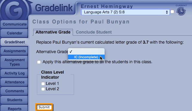 - Click Submit. This Alternative Grade will display on the student’s report cards and transcripts in place of a letter or percentage grade.