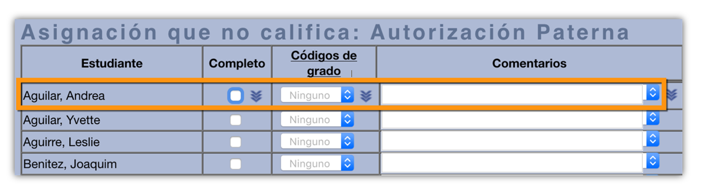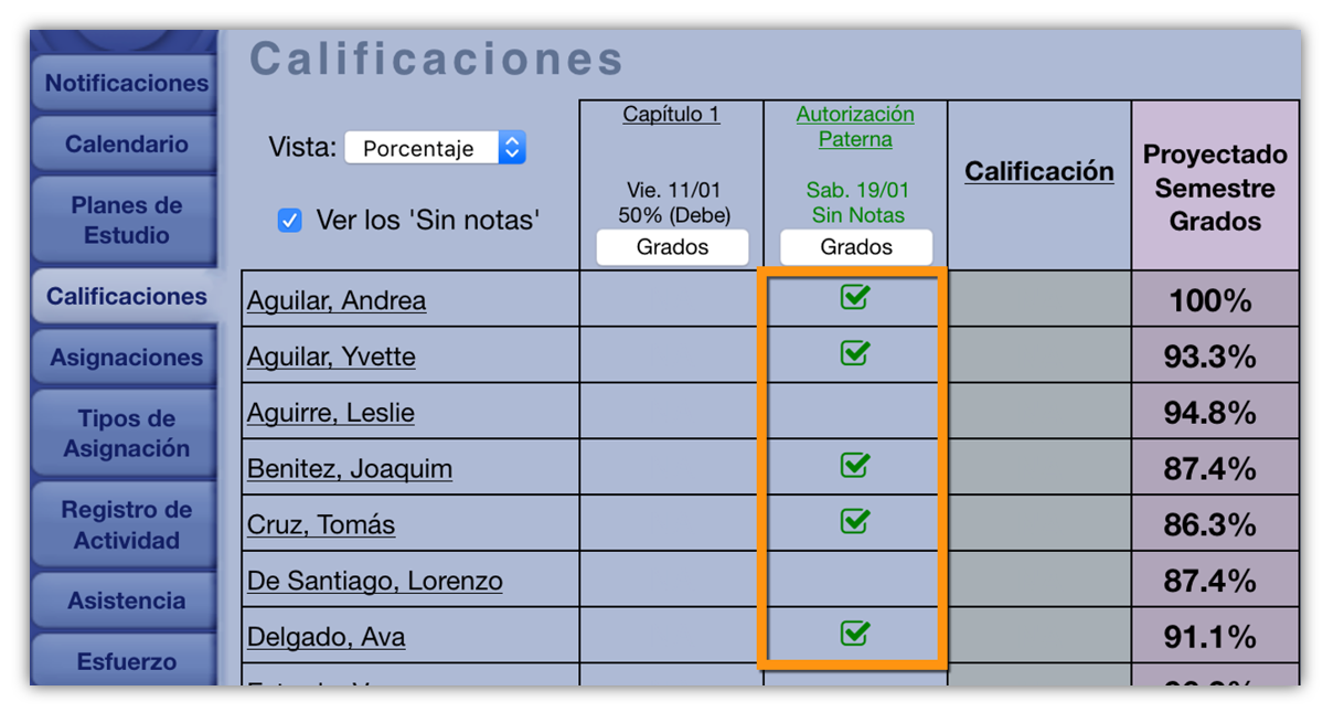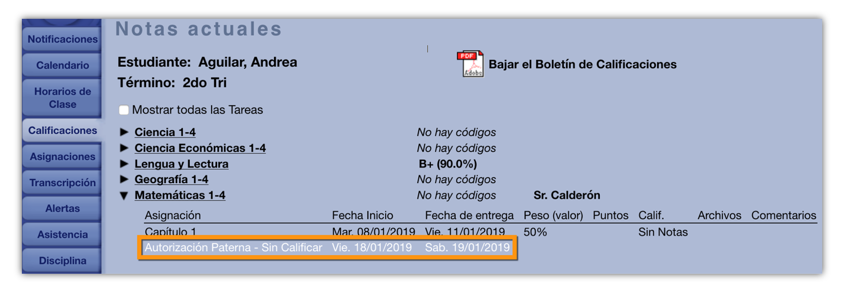 En la interfaz de Estudiante / Padre, cualquier tarea no calificada aparecerá en verde, sin peso ni valor o grado o calificación asociado.