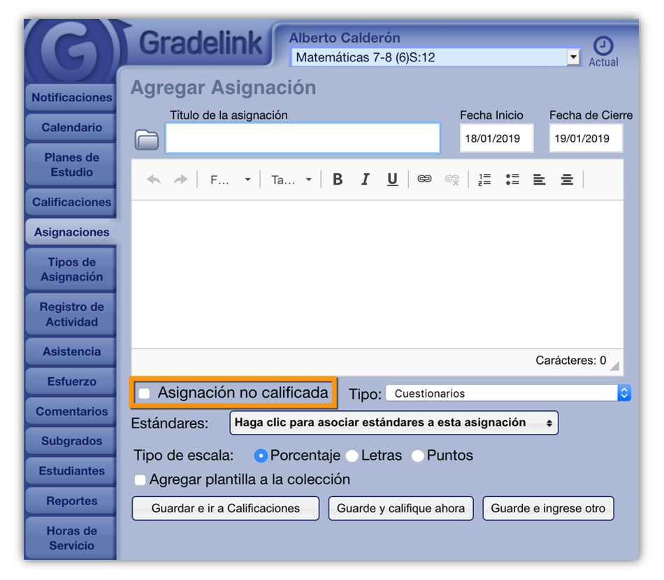 ¿Tiene tareas u otras asignaciones que no afecten las calificaciones generales? Utilice el tipo de 'Asignación no Calificada'.