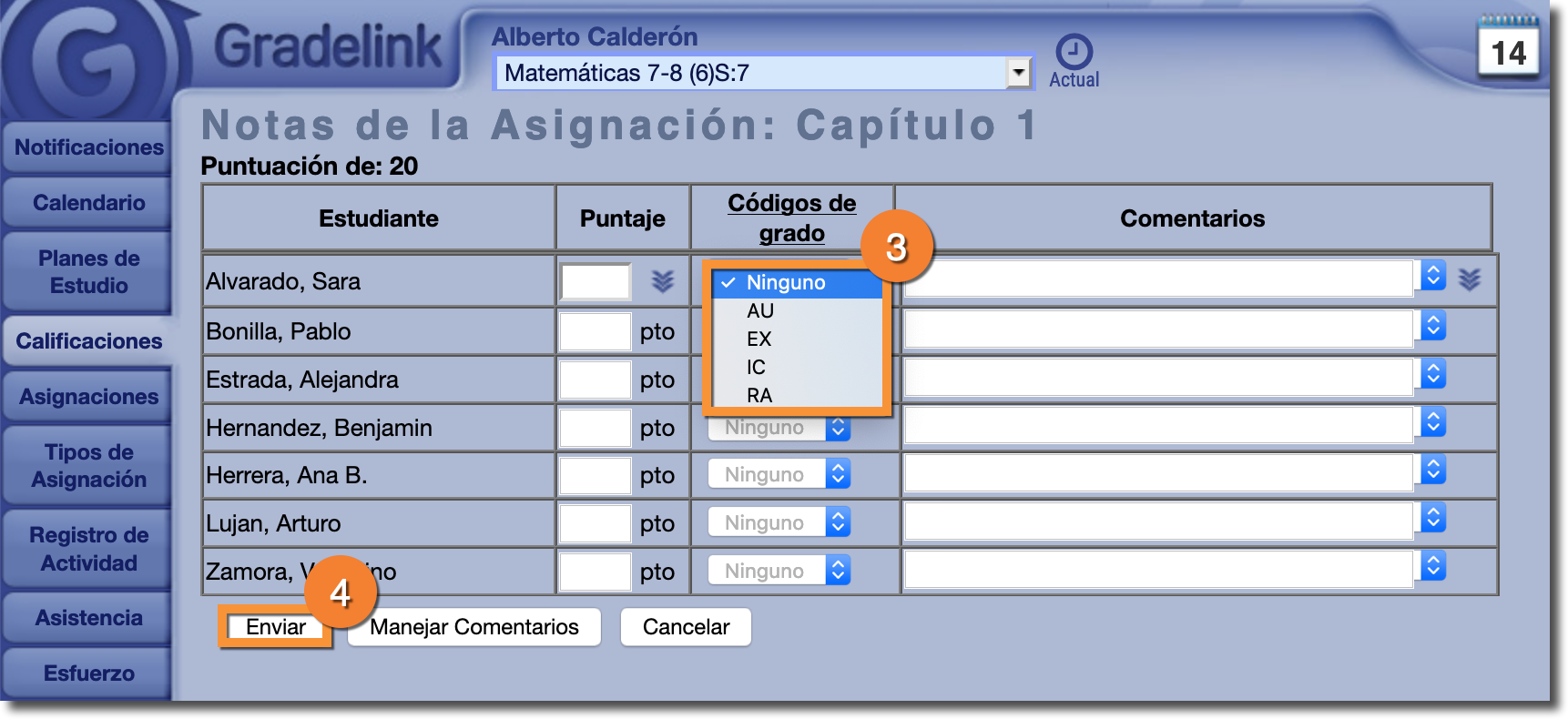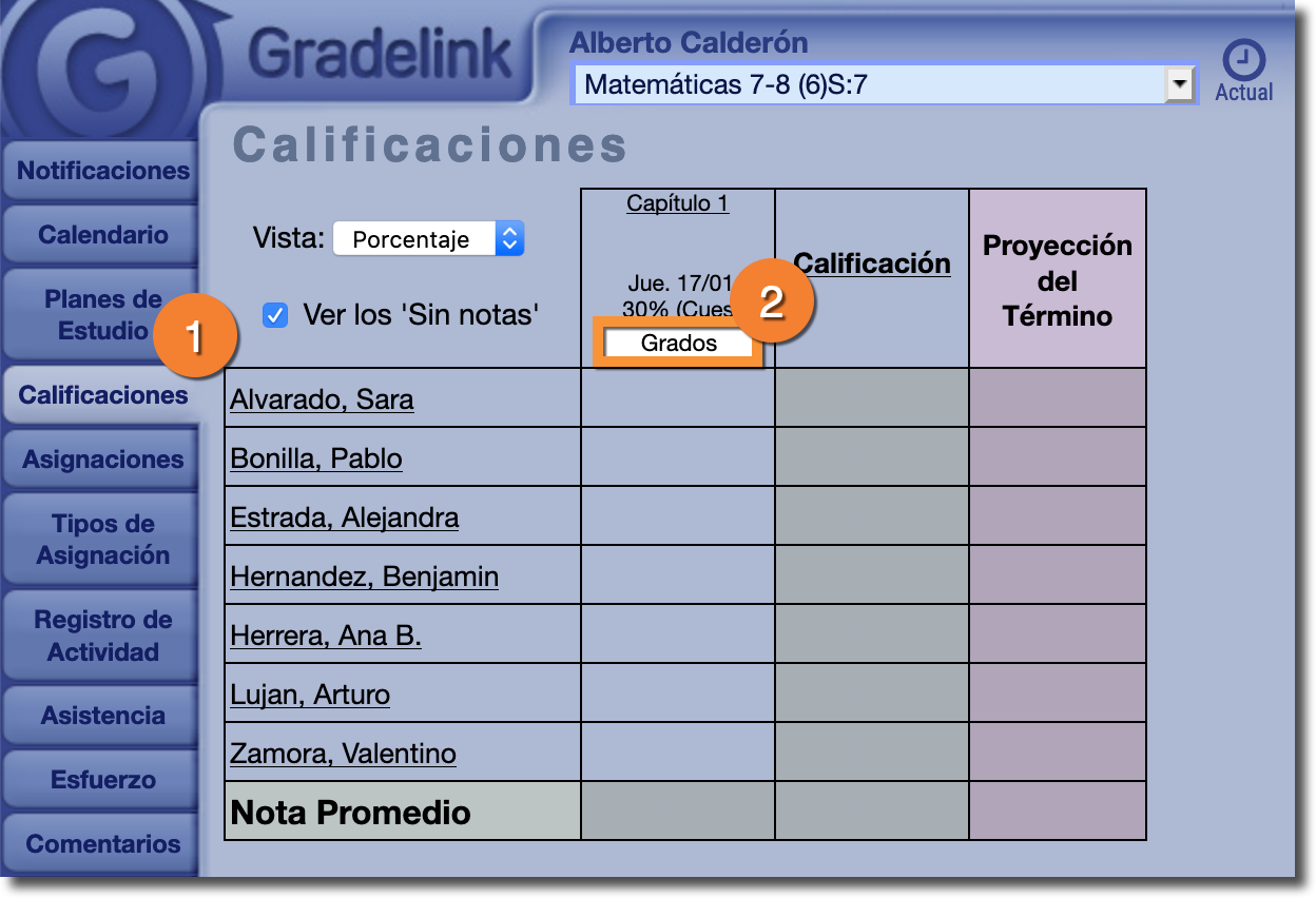 1. Como profesor, seleccione la pestaña Calificaciones en la barra lateral izquierda.