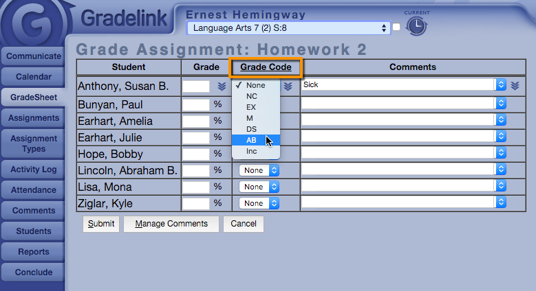 5. Click Submit. The new Grade Code will now display on the GradeSheet as well as in the student/parent portal in both the desktop and the mobile app.