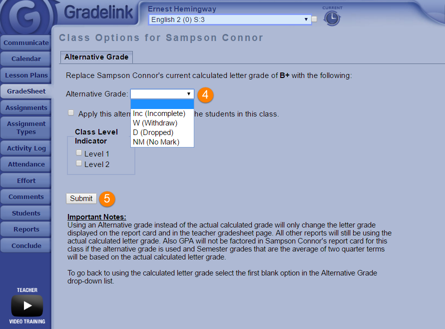 4. Click on the alternative grade box and make the appropriate selection.