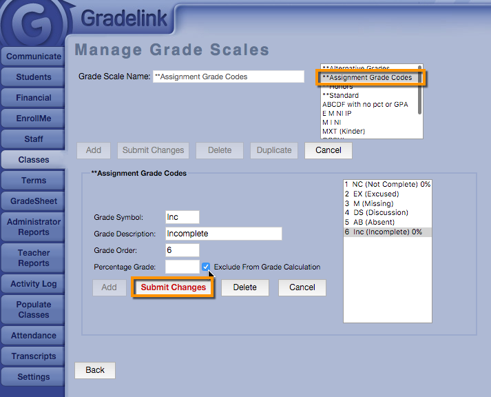 Assignment Grade Codes are a built-in grade scale that allow Teachers to assign grades such as "Absent", "Excused" or "Incomplete" to assignments. In contrast to Alternative Grades, which overwrite a student's grade in a class, Assignment Grade Codes are only intended to overwrite a student's grade on an individual assignment.
