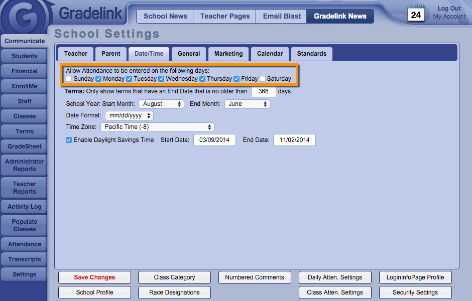 Gradelink gives administrators the ability to determine which days of the week will be available when it comes to scheduling classes and taking attendance.