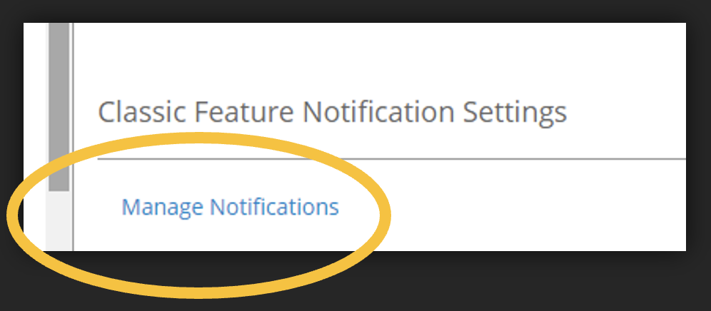 - Scroll to the bottom of the page and click Manage Notifications under Classic Feature Notification Settings