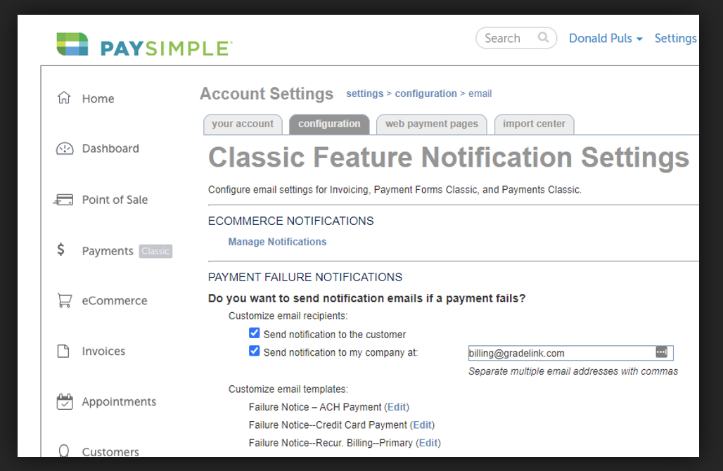 - Select which emails you want sent to your customers and or staff, like payment failures and credit card expirations.