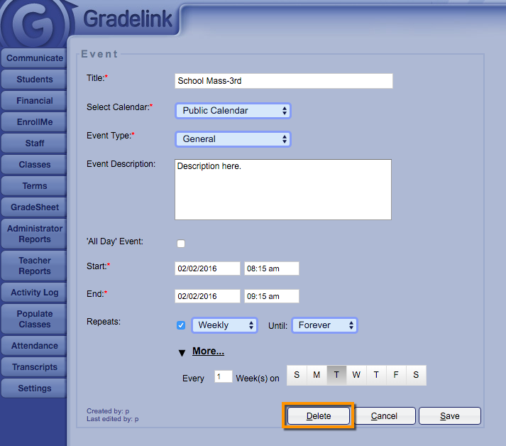 Para eliminar el evento, haga clic en el botón "Eliminar" en la parte inferior de su pantalla.
