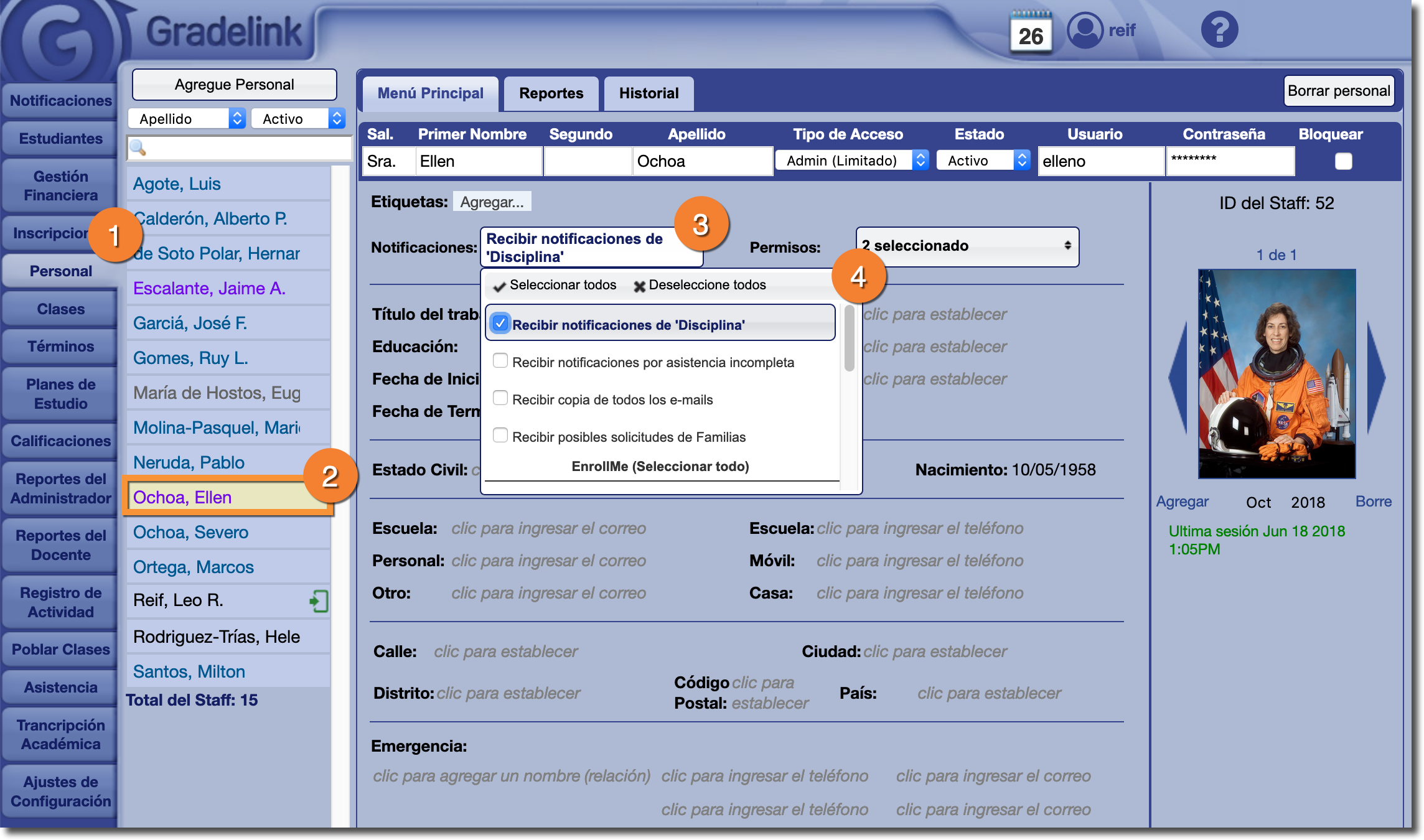 Nota: Las notificaciones de administrador requieren una dirección de correo electrónico que funcione. Si su cuenta de Gradelink no tiene una dirección de correo electrónico en el campo "Escuela", no podrá recibir notificaciones.