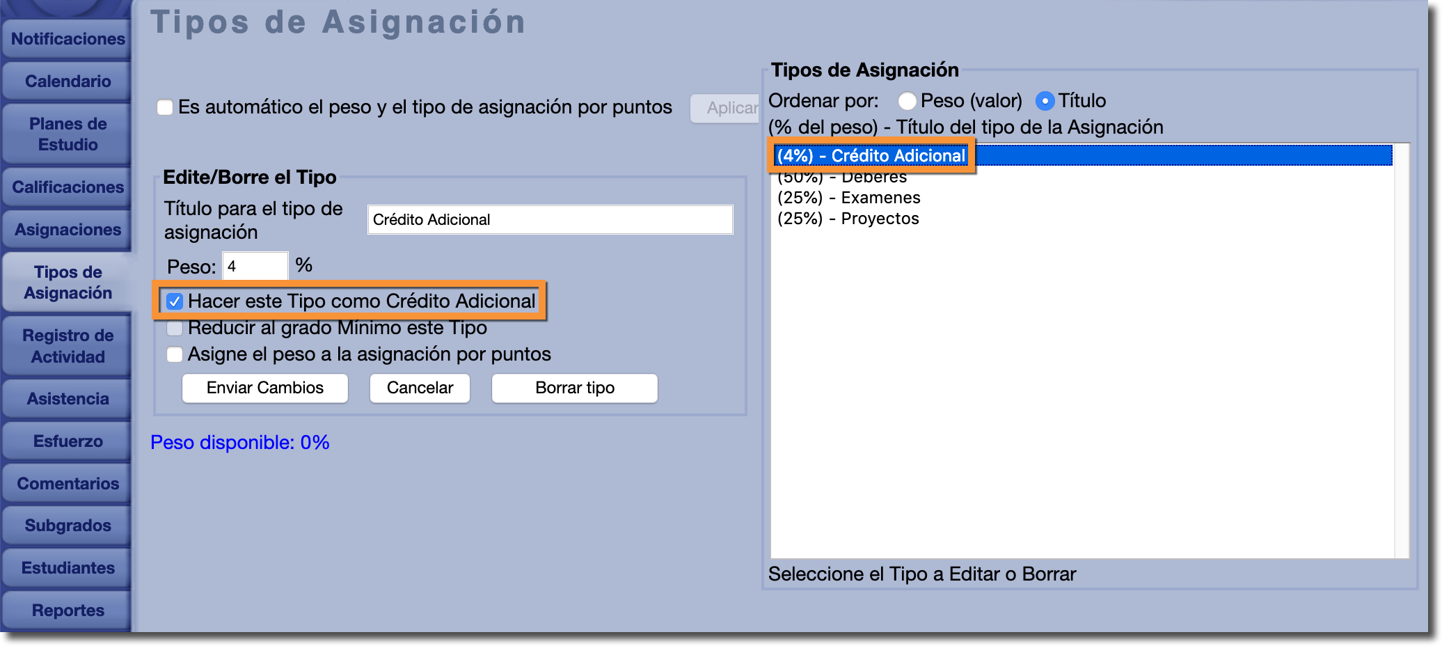 Los Tipos de Asignación asignan un cierto porcentaje de la calificación general de la clase. Esto también se conoce como 'Peso'. Normalmente, el peso de todos los tipos de asignación debe sumar exactamente el 100%.
