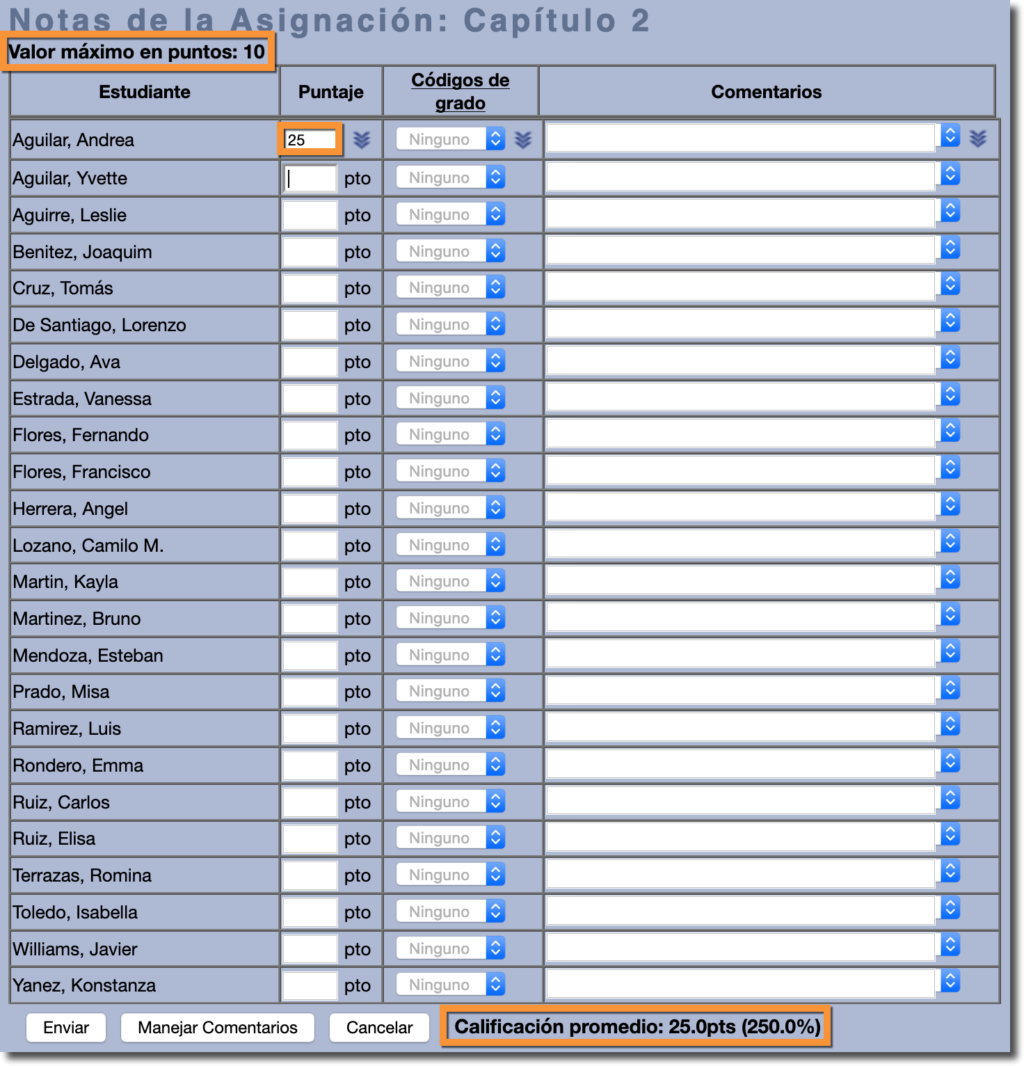 En el ejemplo, una tarea vale 10 puntos, pero un estudiante puede recibir hasta 25 puntos. Esta es la primera manera en que los maestros pueden ingresar crédito adicional.