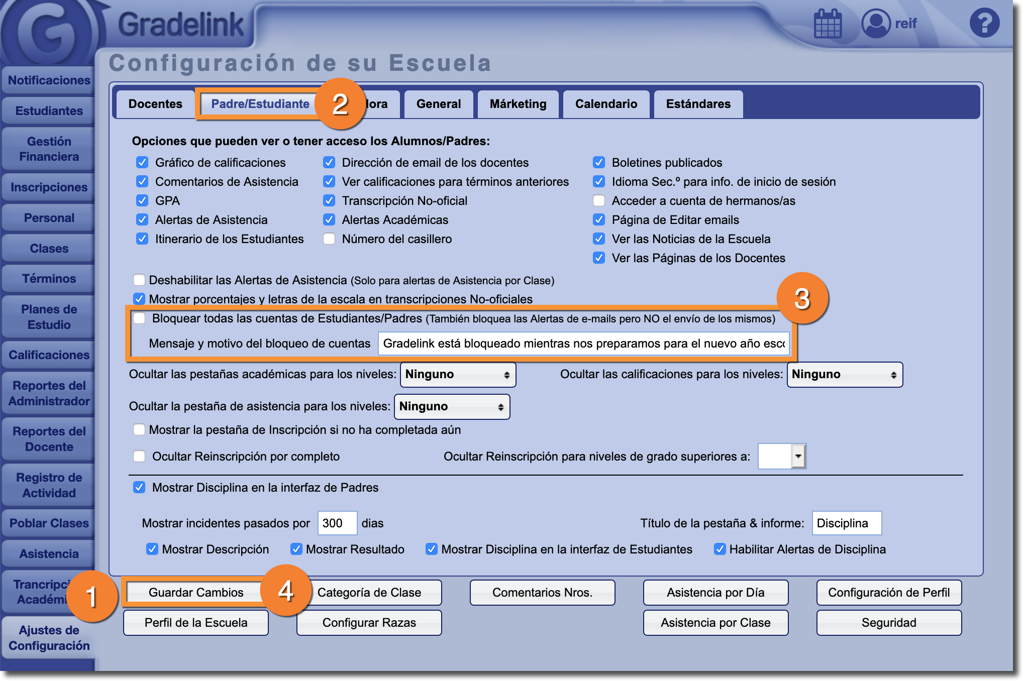 Algunas escuelas eligen bloquear las cuentas de los estudiantes y padres mientras se crean los boletines de calificaciones o durante el verano. Esta opción bloqeua todas las cuentas, aunque no les impedirá recibir mensajes de la escuela a través de la pestaña Notificaciones.