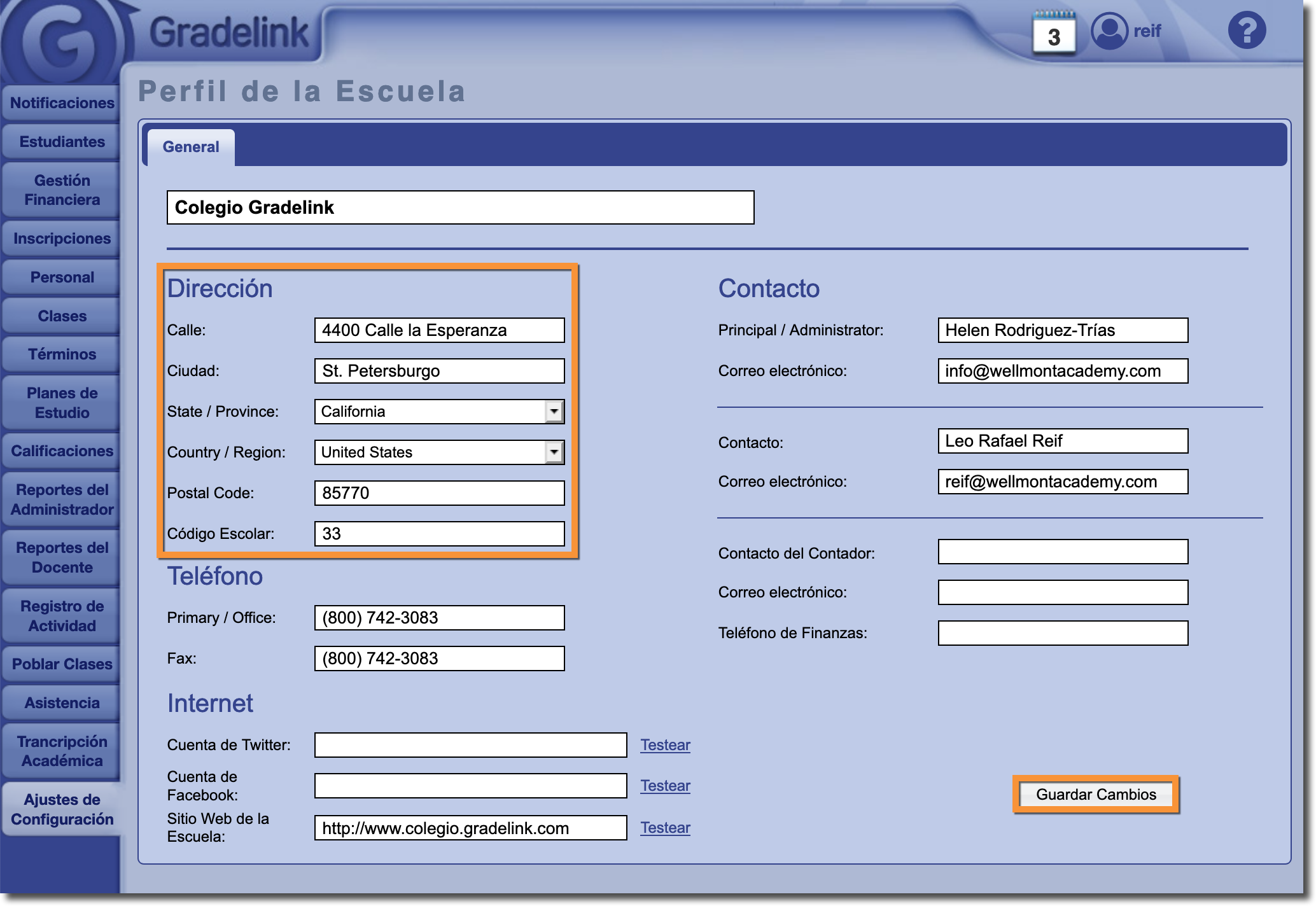 Aquí podrás actualizar la dirección de tu escuela. También puede actualizar otra información, como la información de contacto de la escuela. No olvides hacer clic en Guardar Cambios cuando hayas terminado.