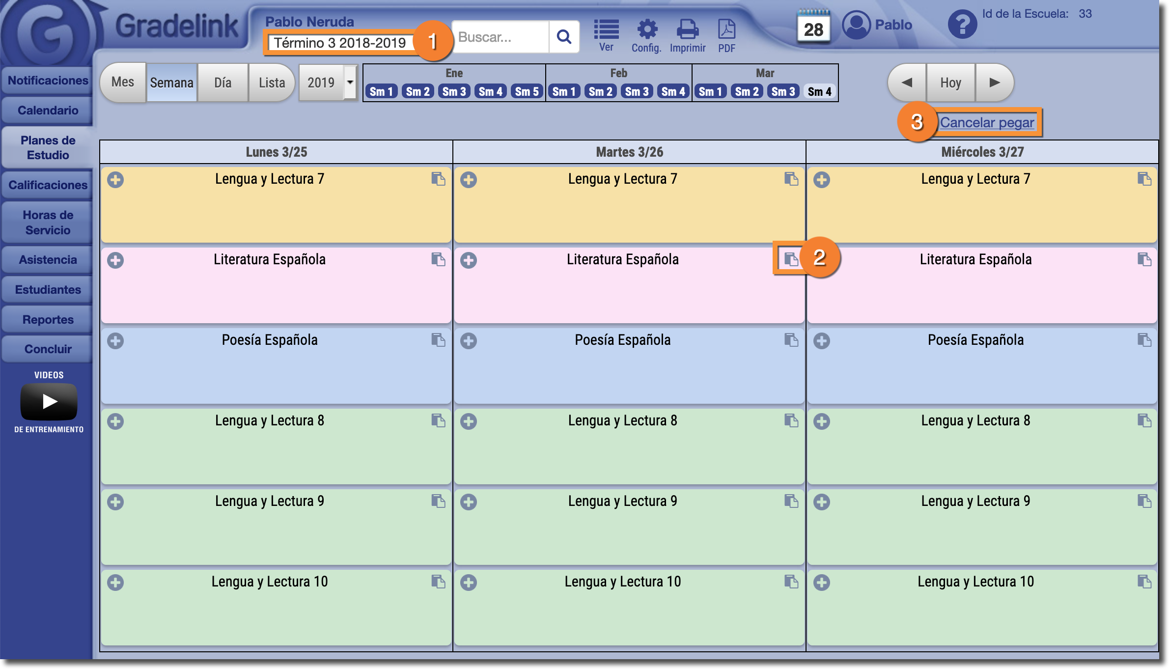 Con las herramientas Copiar y Pegar, los profesores pueden hacer una copia de un plan de estudio existente, cambiar a otro término y luego pegar el plan copiado.