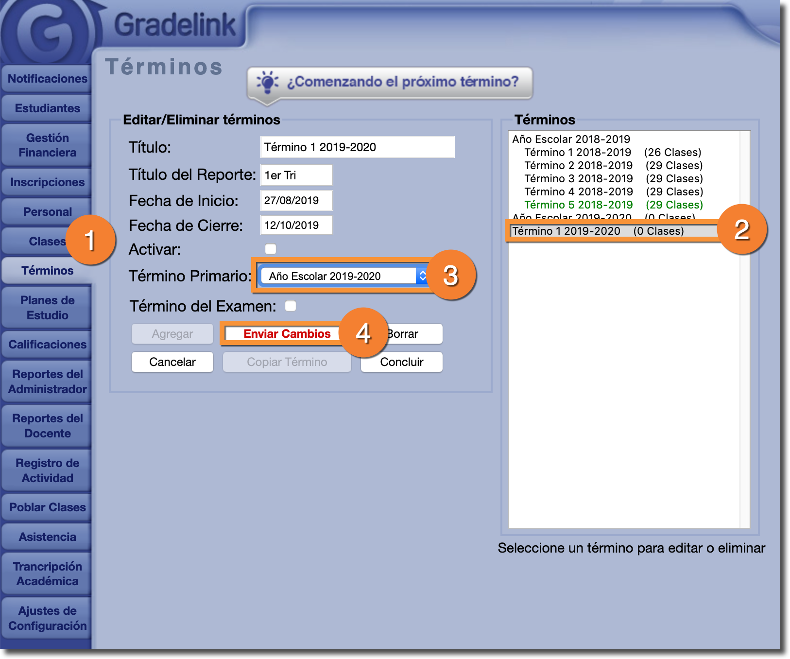 Nota: Cuando asigne términos secundarios a un término primario, la Fecha de Inicio del primer término y la Fecha de Cierre del último término debe coincidir con la Fecha de Inicio y la Fecha de Cierre del término primario. Por ejemplo, el Semestre debe tener una Fecha de Inicio que coincida con el primer término secundario y una Fecha de Cierre que coincida con el segundo término secundario.