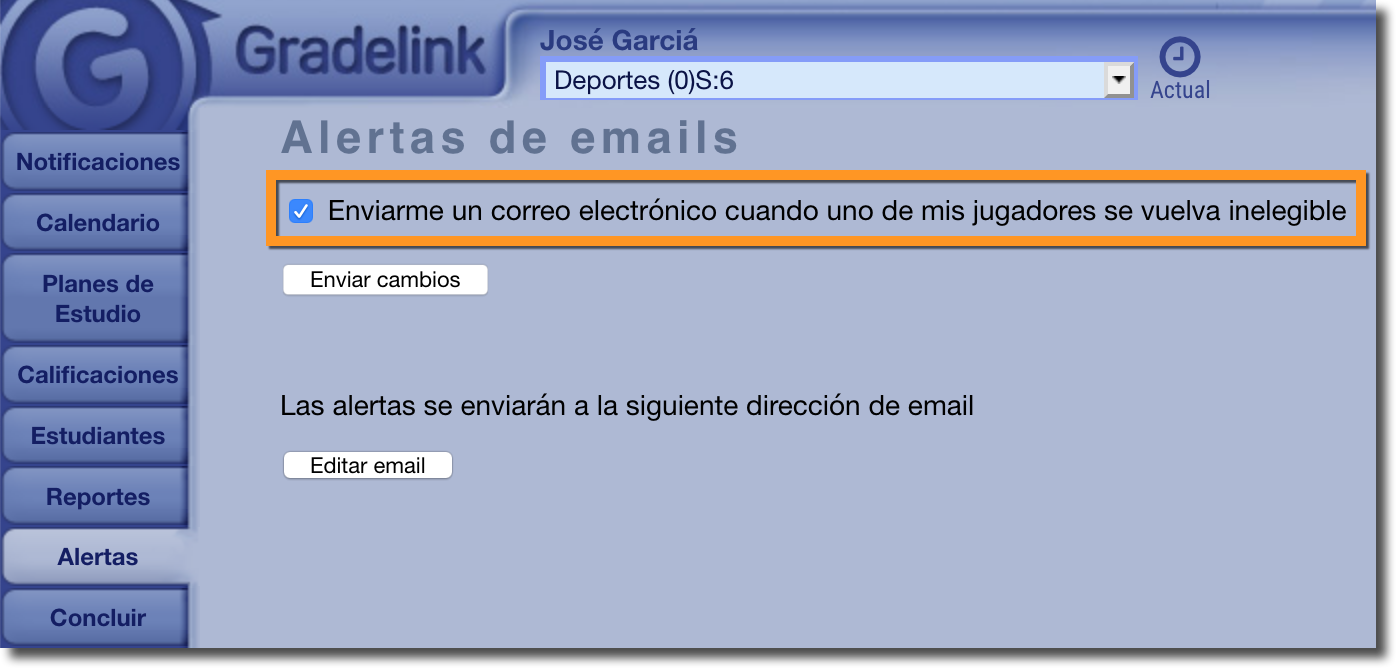 - Los maestros (o entrenadores) pueden recibir alertas por correo electrónico cuando los jugadores no son elegibles.