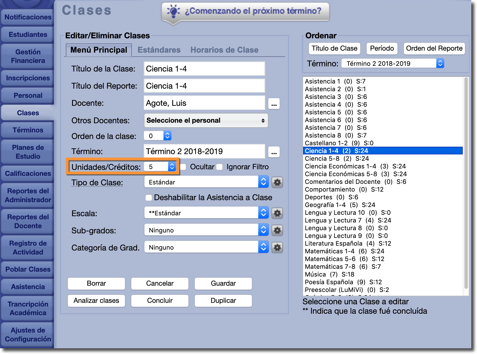 El valor de "unidades/créditos" para cada clase se extrae de la pestaña Clases.