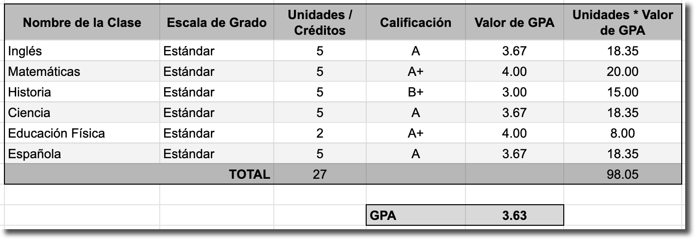 La razón por la cual Gradelink no simplemente promedia los valores del GPA es porque al hacerlo se ignora el hecho de que cada clase vale una cantidad diferente de unidades. En el ejemplo anterior, la clase de "Educación Física" solo vale 2 unidades, por lo que si promediamos los valores de GPA juntos e ignoramos el conteo de unidades, el resultado final es que cada clase vale la misma cantidad que el GPA general.