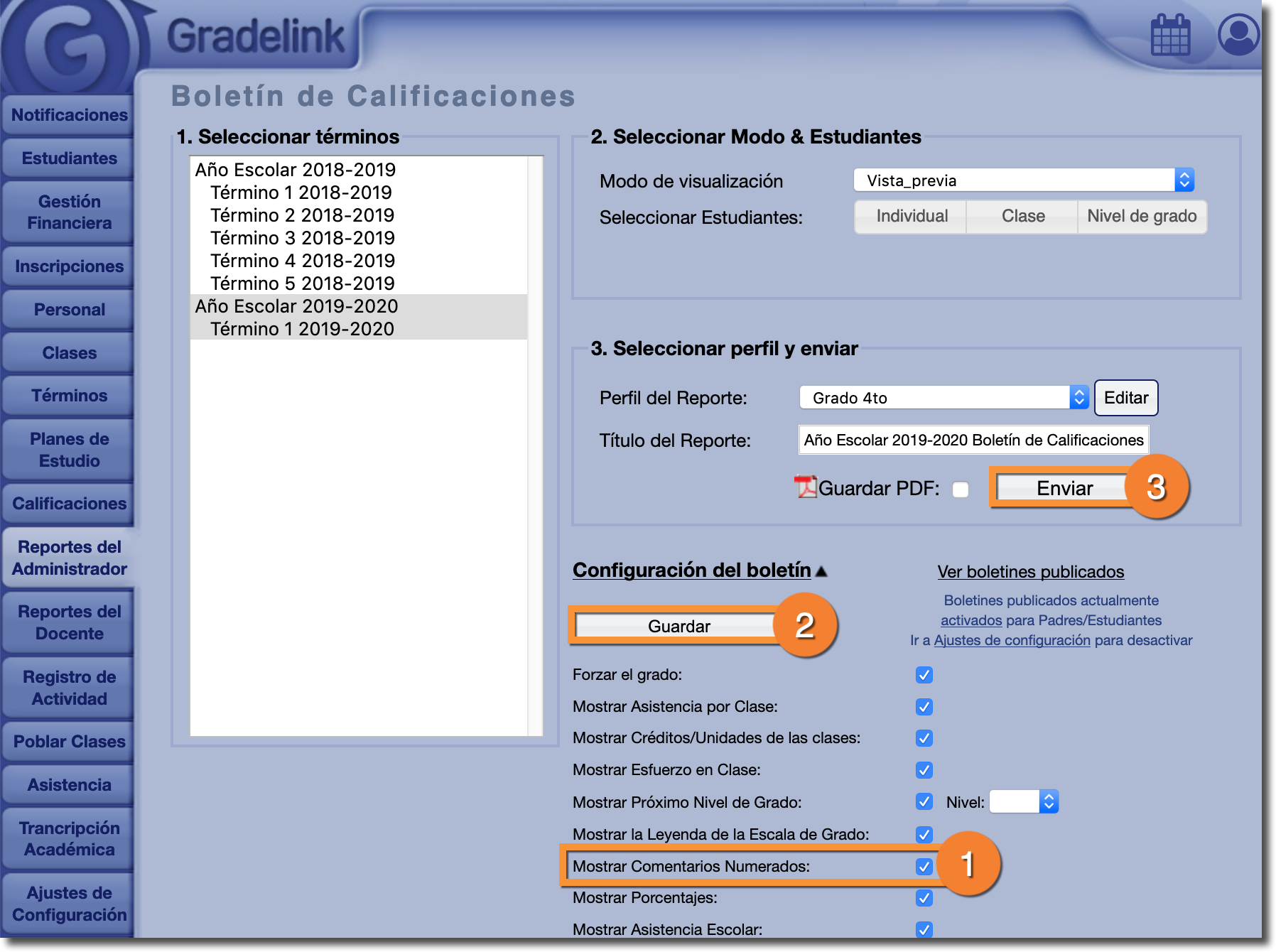 - En la página de generación de boletín de calificaciones, abra el menú Configuración del boletín y marque la casilla Mostrar comentarios numerados