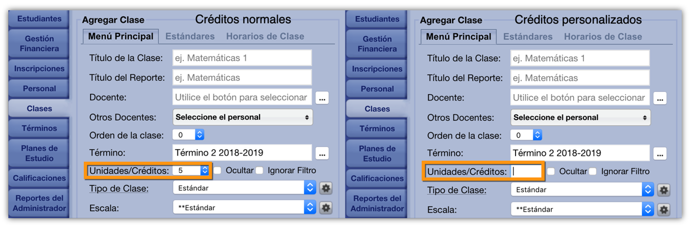 - Si su escuela ha habilitado créditos personalizados, verá un campo llamado Unidades / Créditos donde puede ingresar créditos manualmente de la menera que desee. De lo contrario, verá un menú desplegable con valores preconfigurados.