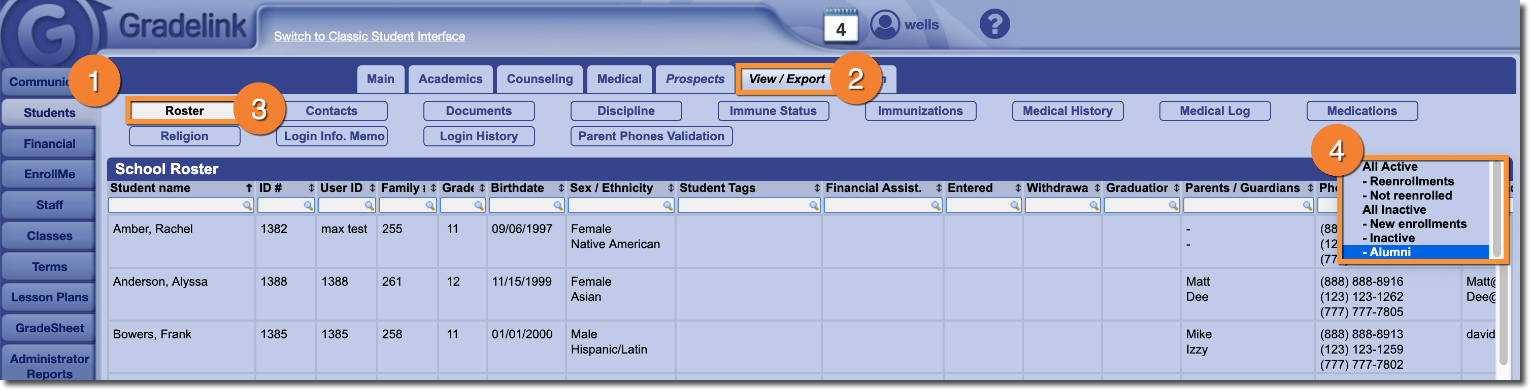 Administrators can generate a list of alumni by using the Student Roster Report. By default, the student roster will display all students with the "Active" status; however, the roster can also be display students that are marked as "Inactive" or as "Alumni".