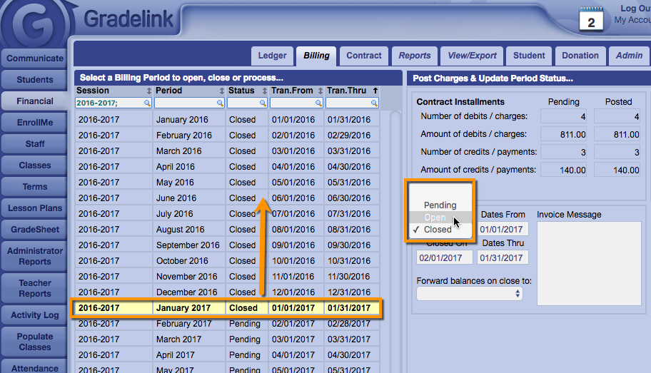 In the current session, set the Period Status of the open period to close and click on the Save button at the lower right. Set the Period Status of the next month to Open and click on the Save button. Follow this procedure until the desired billing period is set to Open.