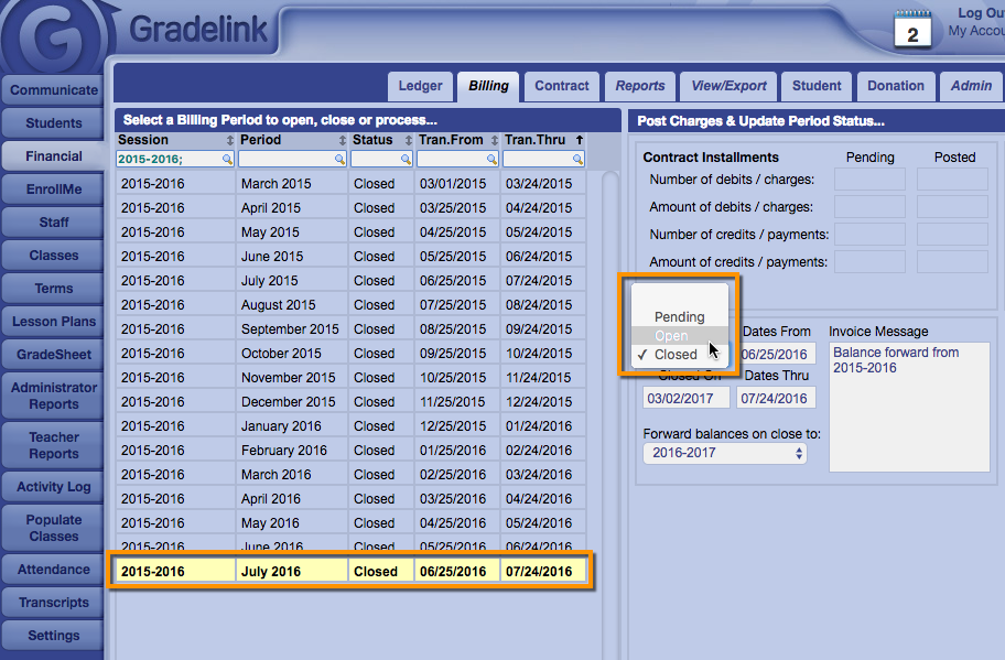 1. Now you will need to change the billing period from the previous session in which balances were transferred open. This will undo the balance transfer and allow you to make edits.