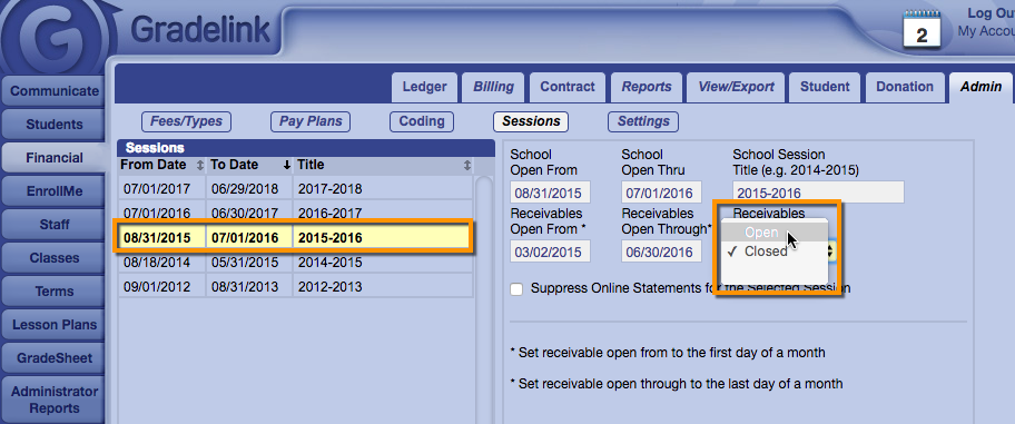 After correcting the error, set the Period Status of the last month of the previous session to close. Click on Admin, click on Sessions, and set the Receivables Edit Status to Close.