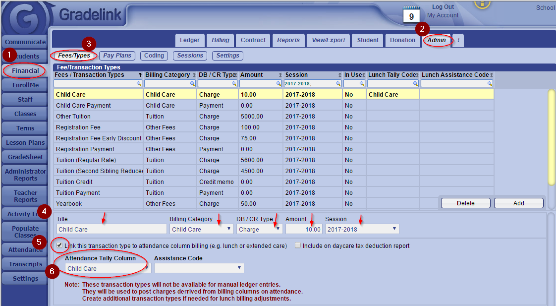 - Click on the box next to “Link this transaction type to attendance column billing” if attendance is used to facilitate child care billing.