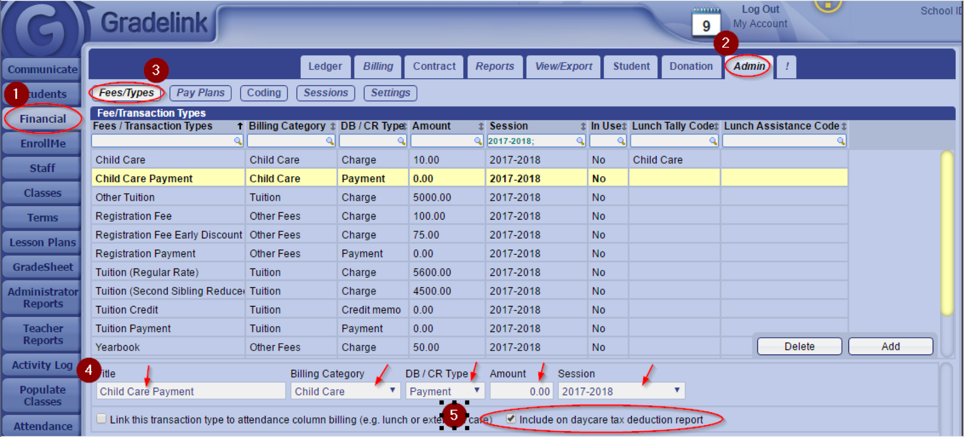 - Click on the box next to “Include on daycare tax deduction report." Gradelink recommends including only the child care payment on the tax deduction report.