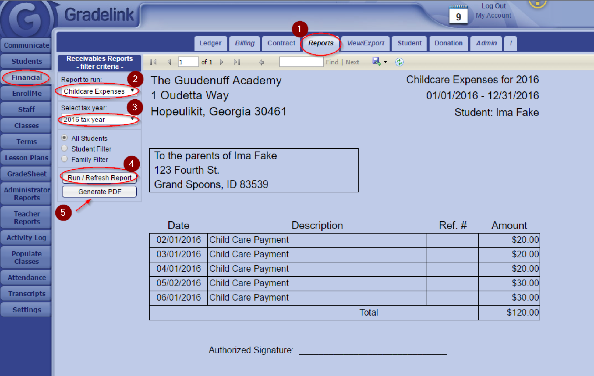 In many cases, if a parent pays for child care they may qualify for a tax credit for these expenses. Gradelink can provide a report showing parents how much they paid for daycare in a given tax year.