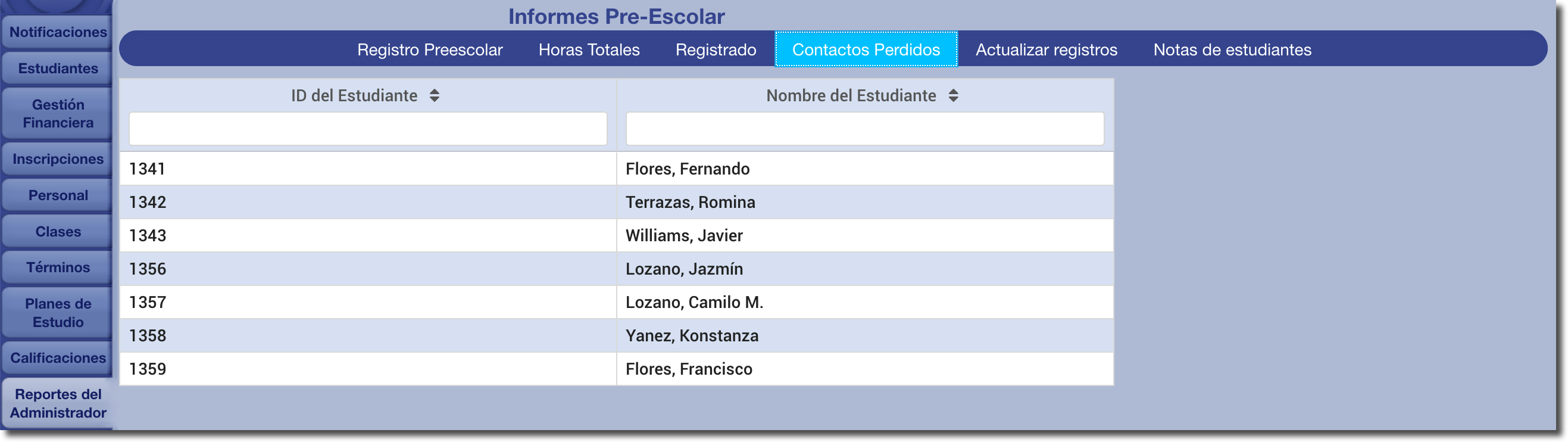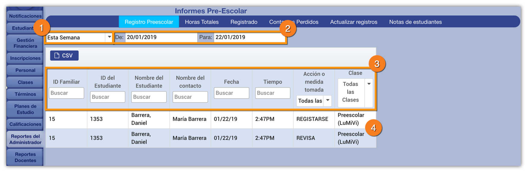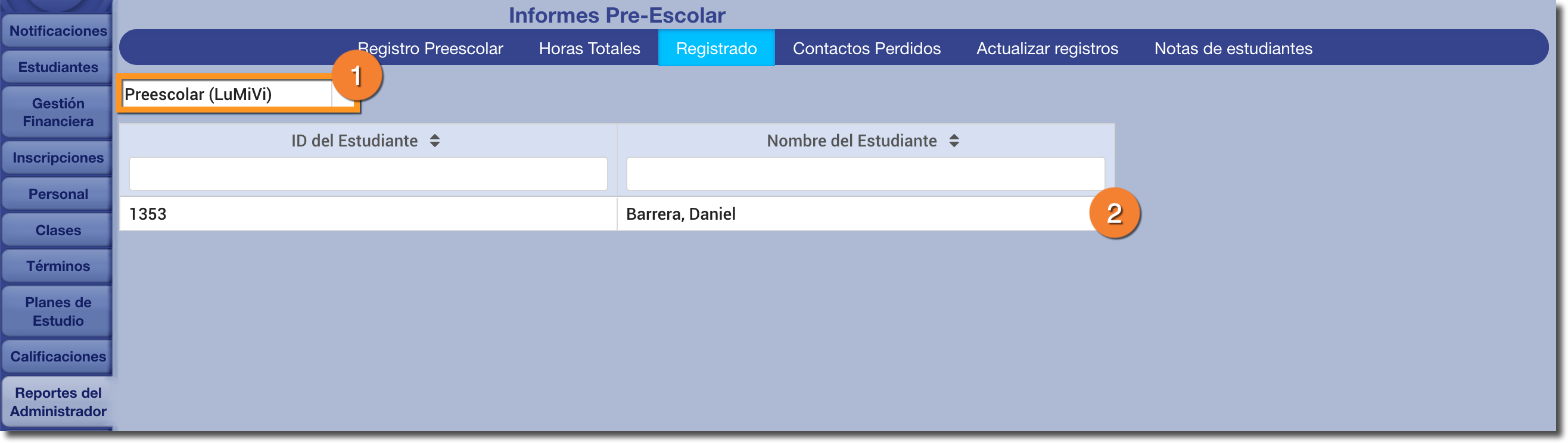 Se puede acceder a los siguientes informes a través del botón Informes de preescolar en la pestaña Informes del administrador (en la parte inferior derecha).
