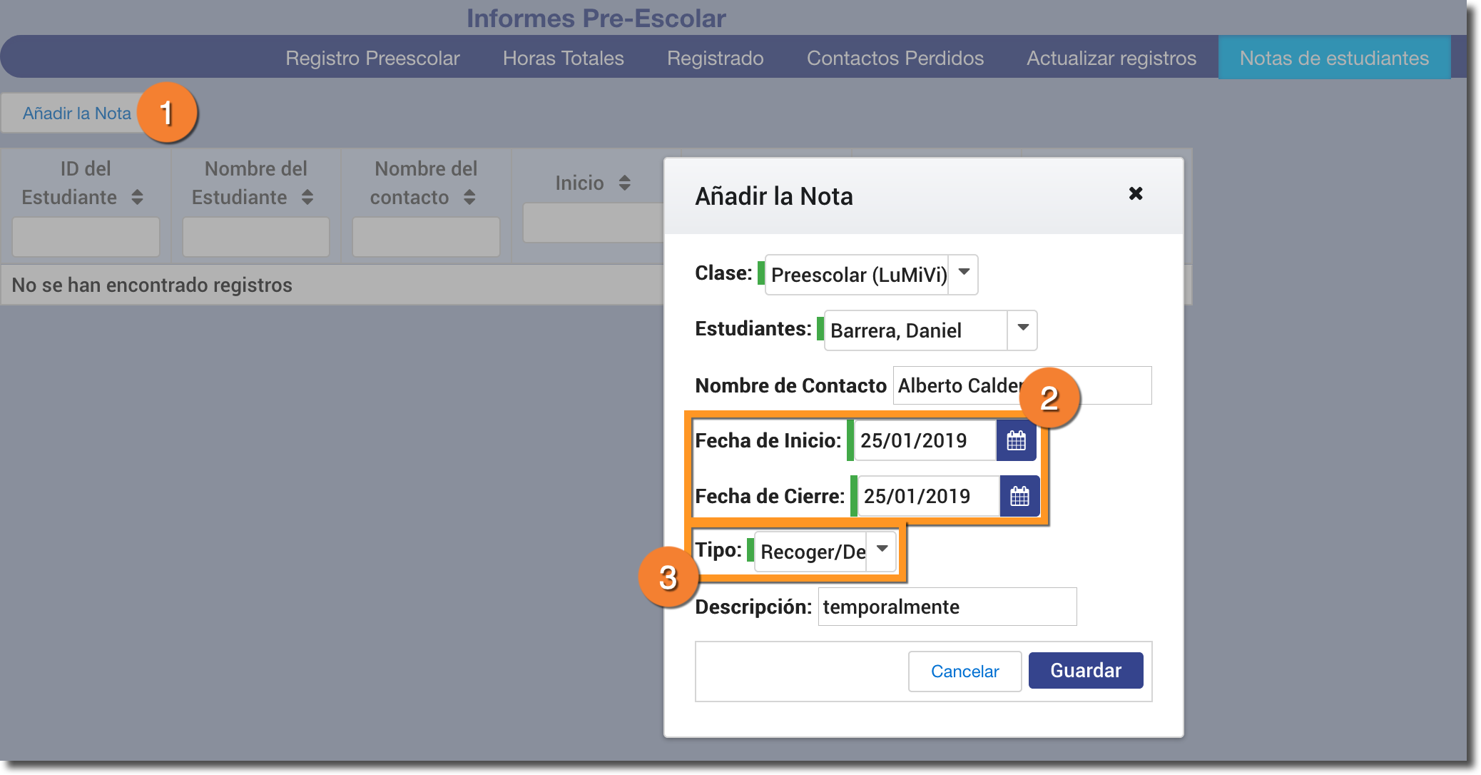 Pueden añadirse personas autorizadas temporalmente a recoger a los estudiantes. Esto es ideal si un vecino o conocido de la familia necesita ocacionalmente por algún motivo recoger un estudiante en un día determinado.