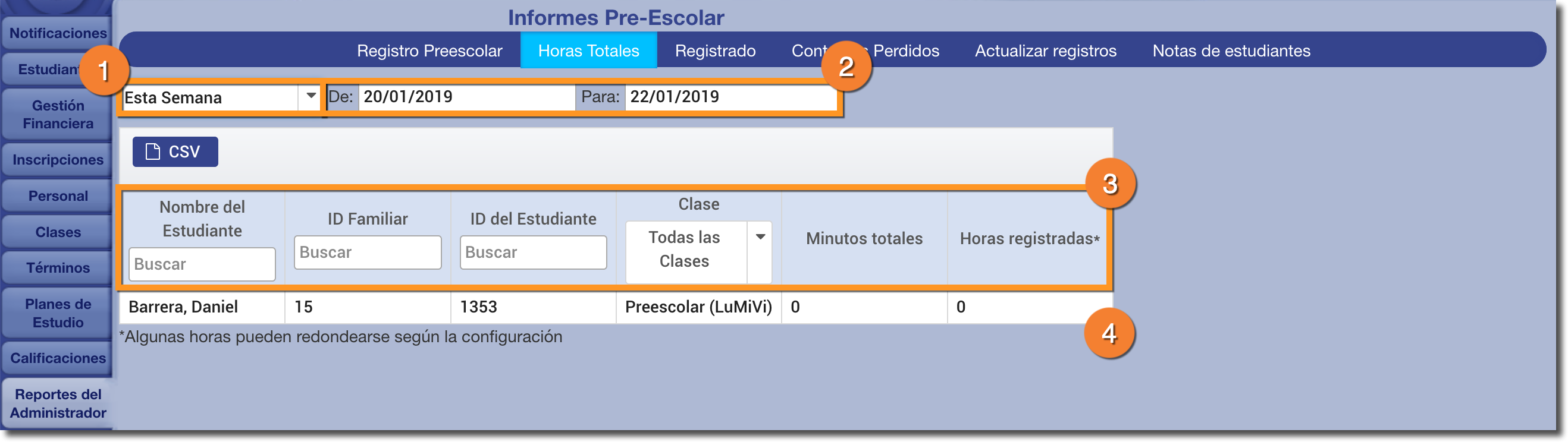 El informe Horas registradas muestra la cantidad total de tiempo registrado para estudiantes específicos. Para usarlo: