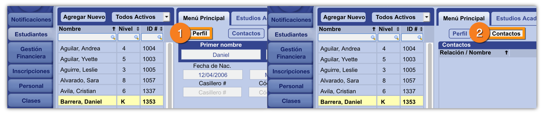 La página de Estudiantes de Gradelink tiene dos áreas en las que se puede incluir un contacto: