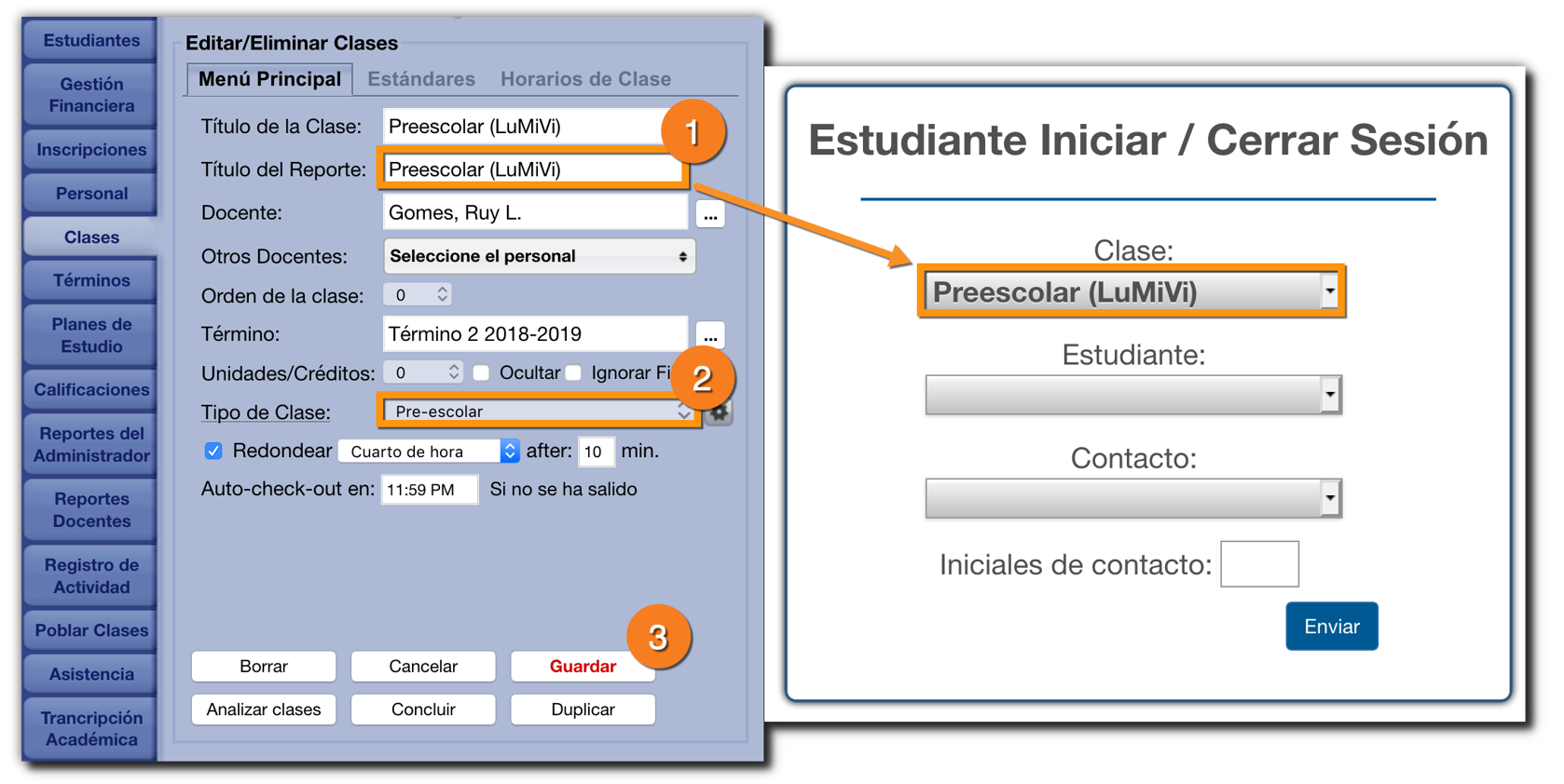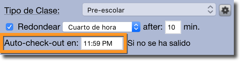 - Establezca el tipo de clase en "Pre-escolar". Esto hará que aparezca el campo "Salida Automática a las" y el campo opcional "Redondear". Configúrelos según corresponda.