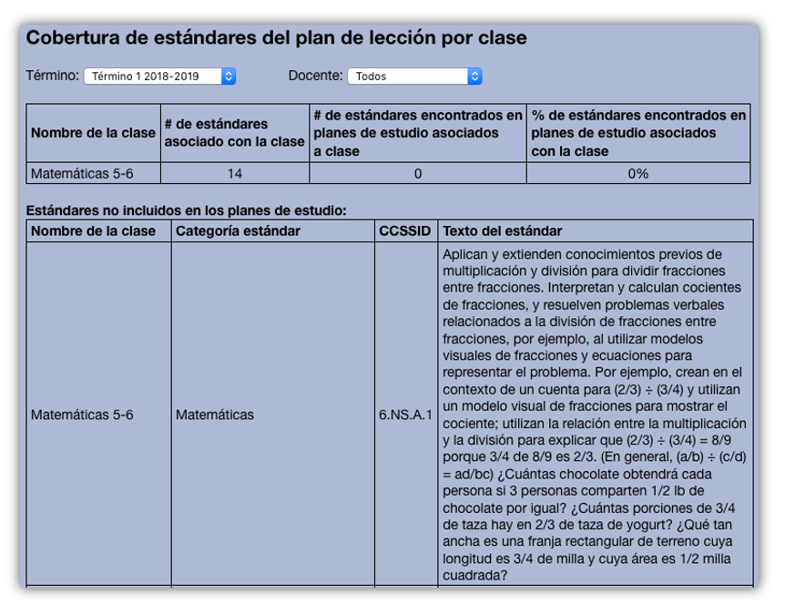 Con el nuevo informe del plan de lecciones o planes de estudio, vea cuántos estándares en una clase se han incorporado a los planes de lección de un maestro.