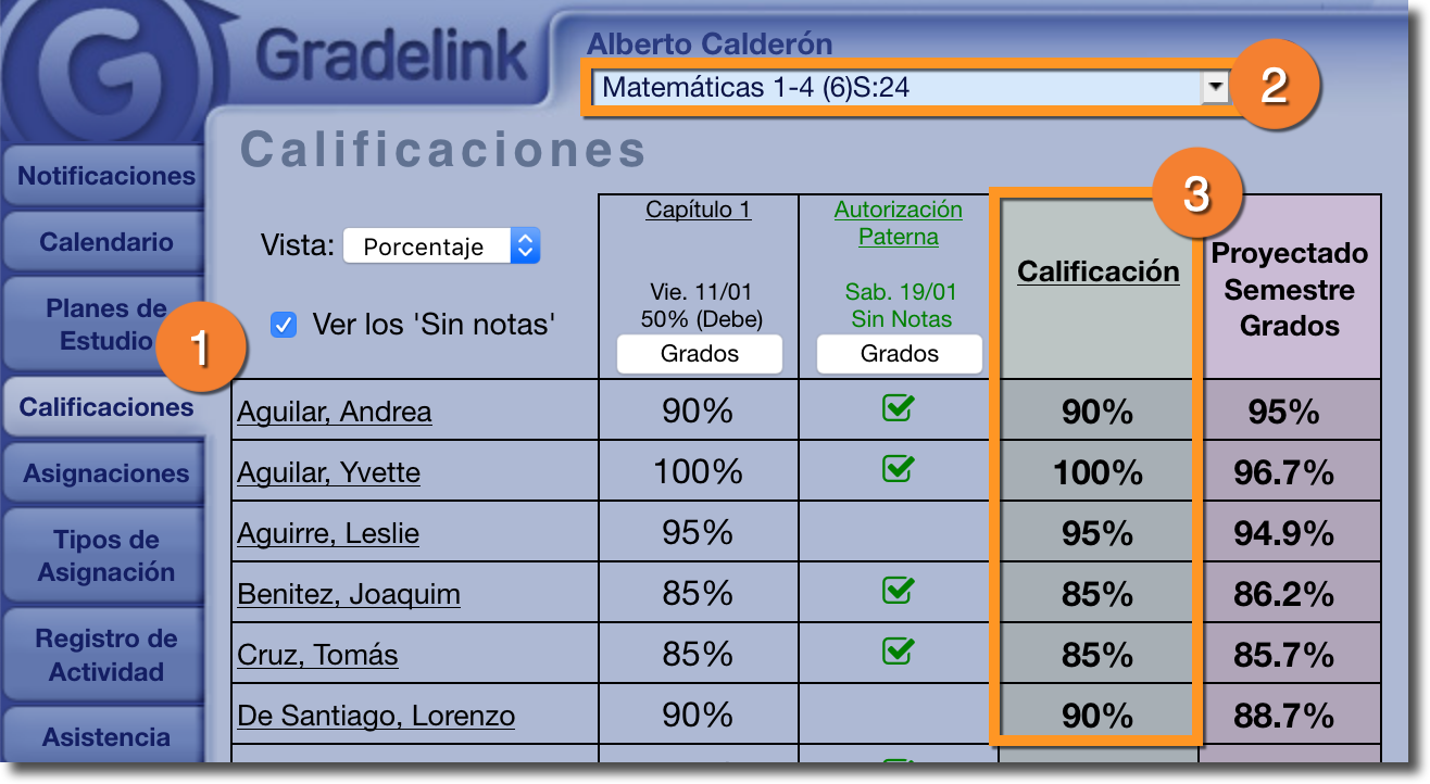 Concluir los estudiantes serán denotados por el texto púrpura en la sección 'Calificaciones'. Como profesor,