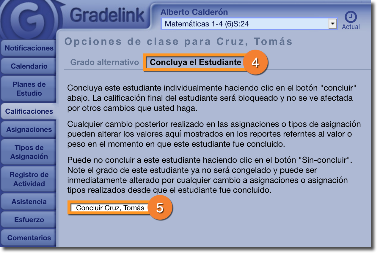Los maestros también pueden concluir a un estudiante individualmente si la opción está habilitada por un Administrador ( contacte al soporte de Gradelink para asistencia ). Esta acción concluirá a un solo estudiante en unasola clase, sin afectar a ningún otro estudiante. Una calificación final no es equivalente a un cero: la calificación final del estudiante en el momento de la conclusión se guardará en los registros del expediente académico y posteriormente se mostrará en la boleta de calificaciones del estudiante. Todos los cambios posteriores de GradeSheet no afectarán la calificación final del estudiante .